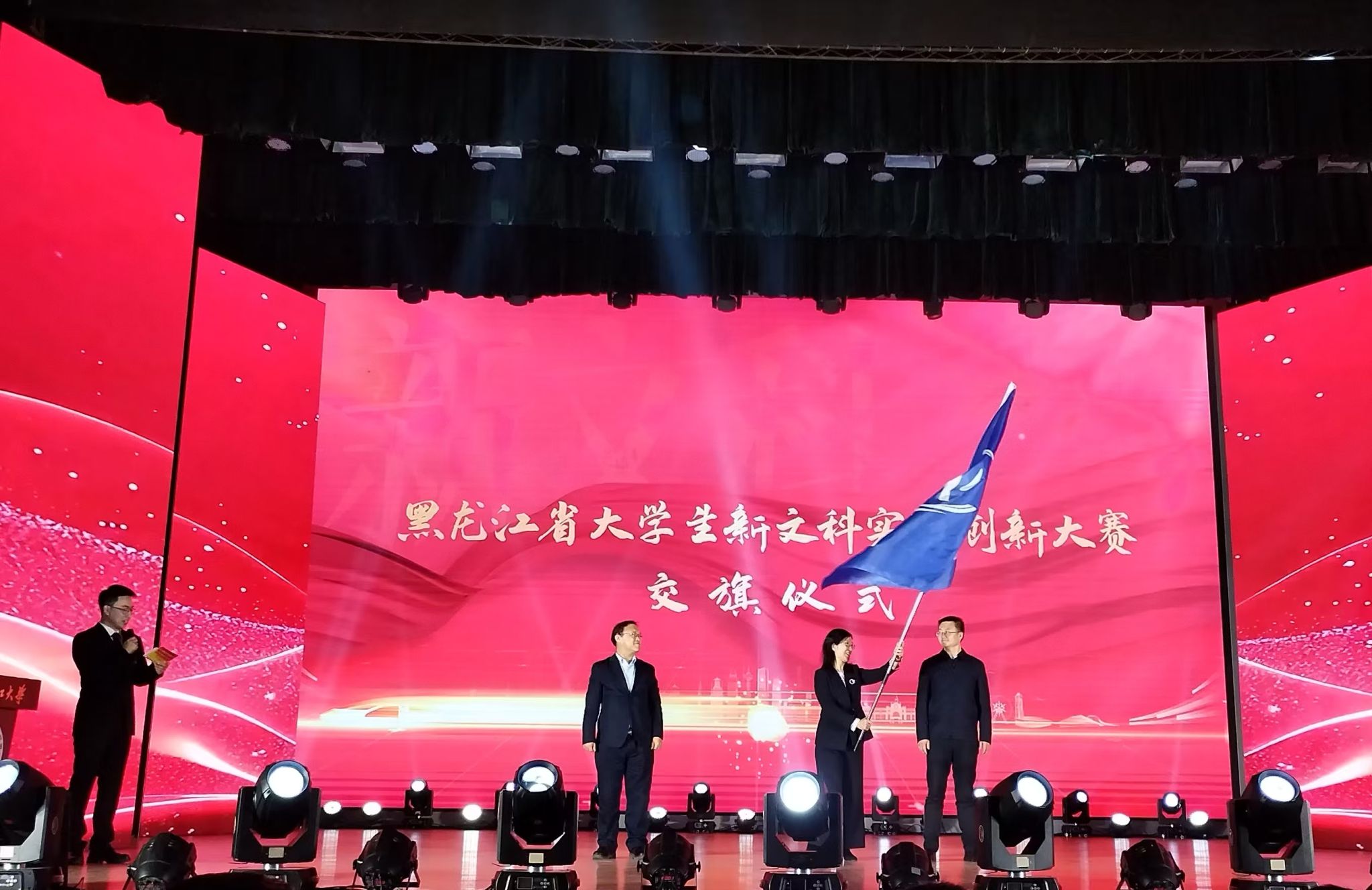 会议现场为新文科实践创新大赛省赛金奖学生代表、优秀指导教师代表、优秀组织奖单位颁奖。完成了大赛承办校交旗仪式,下一届新文科实践创新大赛将由哈尔滨师范大学承办。