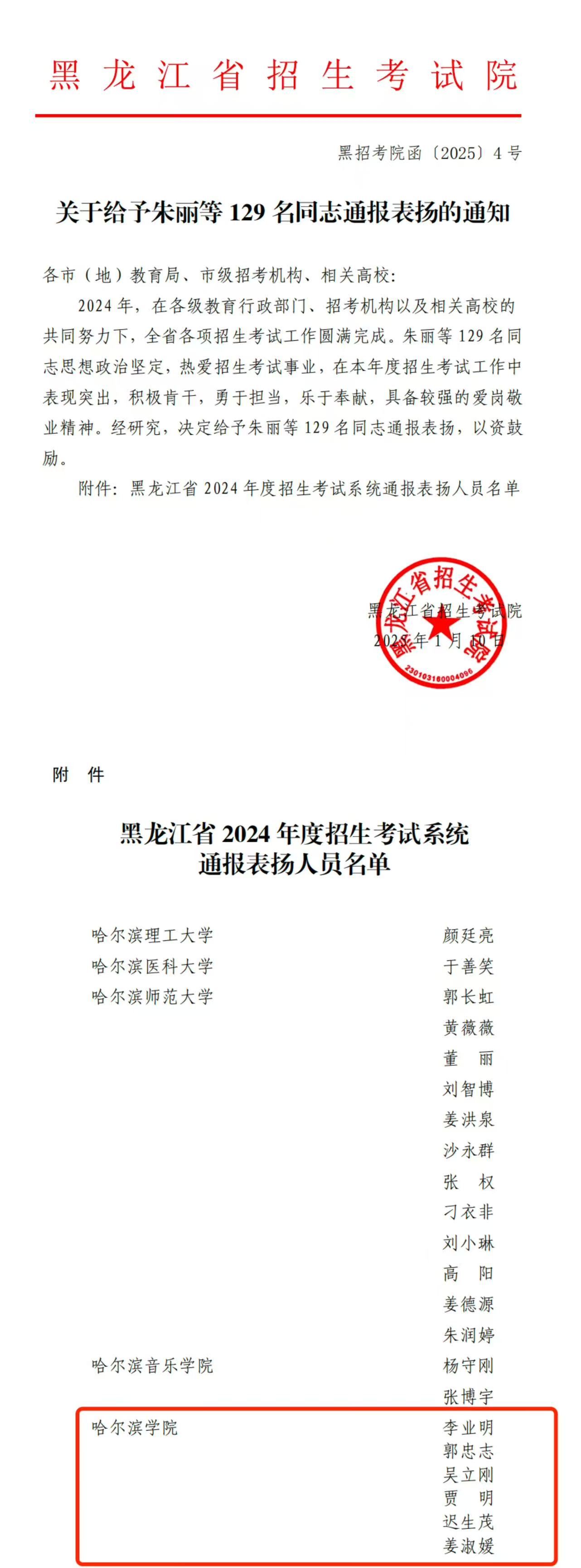 (文/毕甜甜)近日,黑龙江省招生考试院发布《关于给予朱丽等129名同志通报表扬的通知》(黑招考院函〔2025〕4号),对黑龙江省2024年度招生考试工作中表现突出人员进行通报表扬,我校教务处、继续教育学院六位同志榜上有名,这不仅是个人荣誉,更是省招考院对我校招生考试工作的全面认可,充分体现了我校教师在招生考试工作中积极肯干、勇于担当的工作作风,严谨务实、认真履责的工作态度,爱岗勤政、乐于奉献的敬业精神。
