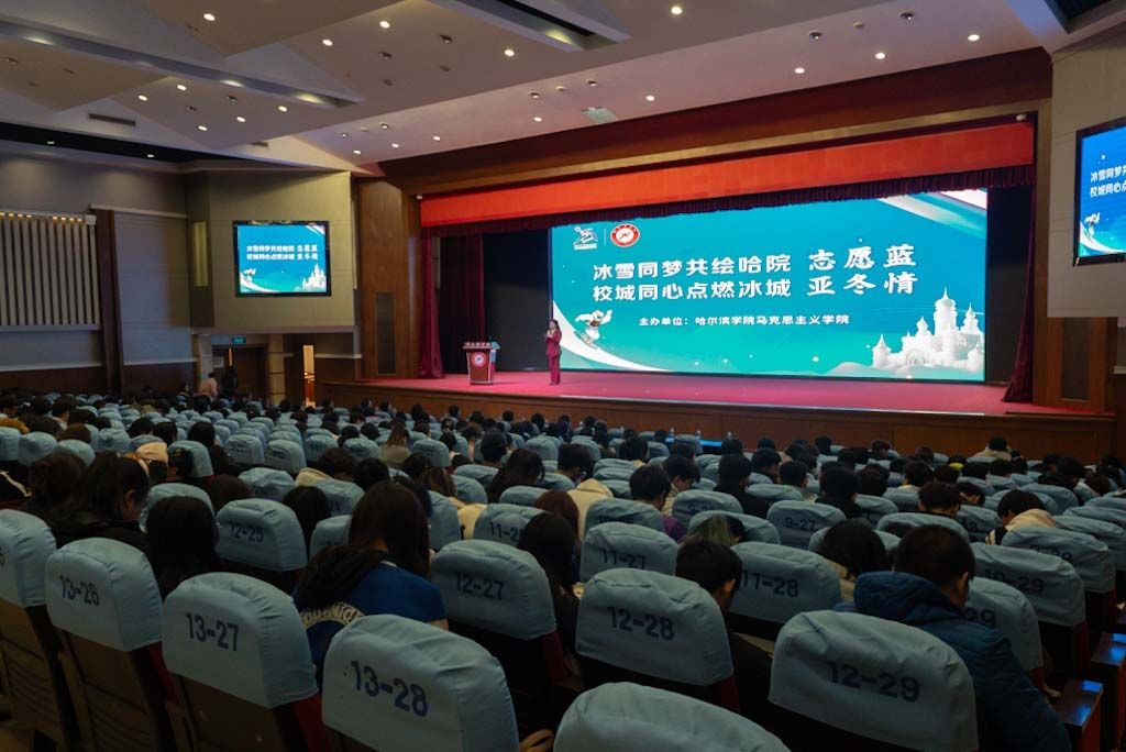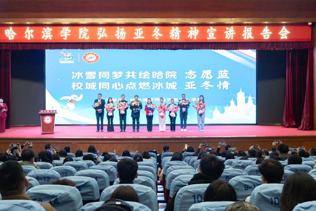 (文/李子木)为大力弘扬亚冬会精神,多维度、全方位讲好校城血脉相连的生动实践,持续深化亚冬会思政教育成果,3月24日下午,学校马克思主义学院举办“冰雪同梦共绘哈院‘志愿蓝’,校城同心点燃冰城‘亚冬情’”弘扬亚冬精神宣讲报告会。报告会特别邀请参与亚冬会服务的学校7名志愿者师生代表担任主讲人,向全校师生分享亚冬故事,传播亚冬精神。校党委副书记李娜、副校长吴旭峰、党委宣传部部长李铁岩、各二级学院党委(党总支)书记、辅导员、马克思主义学院教师及各二级学院学生代表参加报告会。报告会由文法学院辅导员宫鹤桐主持。