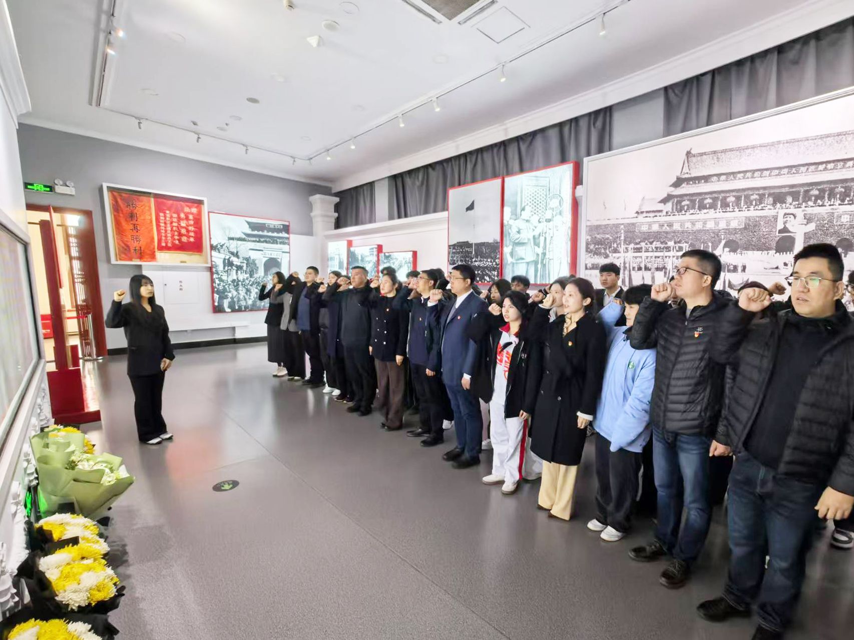 讲解员为师生们详细讲述了赵一曼、杨靖宇、赵尚志、李兆麟、杨子荣等革命先烈的感人事迹,一件件珍贵的烈士遗物、一幅幅历史图片、一段段详实的史料记载,将大家带回到那个烽火连天的岁月。步入审讯室展区,师生们凝视着那些冰冷的刑具和赵一曼烈士关押处原址狭小昏暗的空间,仿佛亲眼目睹了先烈们在艰苦卓绝环境中不屈抗争的身影。参观结束后,音乐与舞蹈学院学生闫卉晴带领师生们面对英烈墙庄严宣誓,“弘扬‘自知弘毅,自强卓越’校风,砥砺奋进,以学识报效祖国”的铿锵誓言在馆内回荡,充分展现出师生们传承红色精神,立志报效祖国的坚定决心。