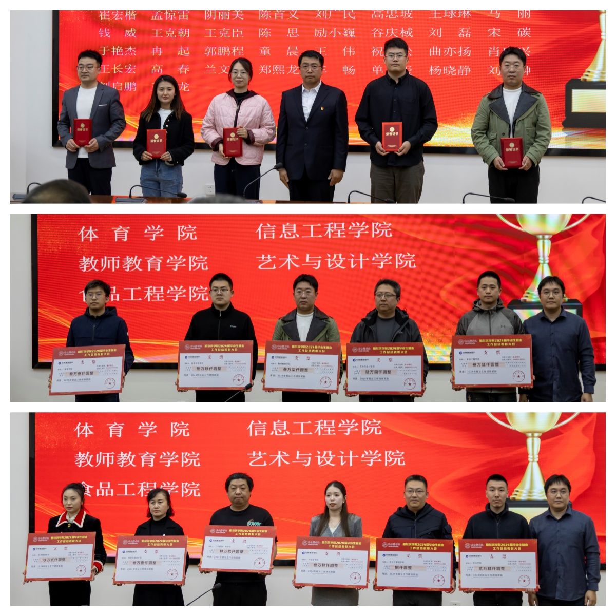 体育学院、地理与旅游学院、教师教育学院、食品工程学院在会上作经验交流发言。校领导分别向荣获“2024年就业工作绩效奖励”“2024届毕业生就业工作先进个人”“2024届毕业生升学优胜单位”“2024届毕业生签约优胜单位”及“2024届毕业生就业工作先进集体”的单位和个人颁发奖状和证书。