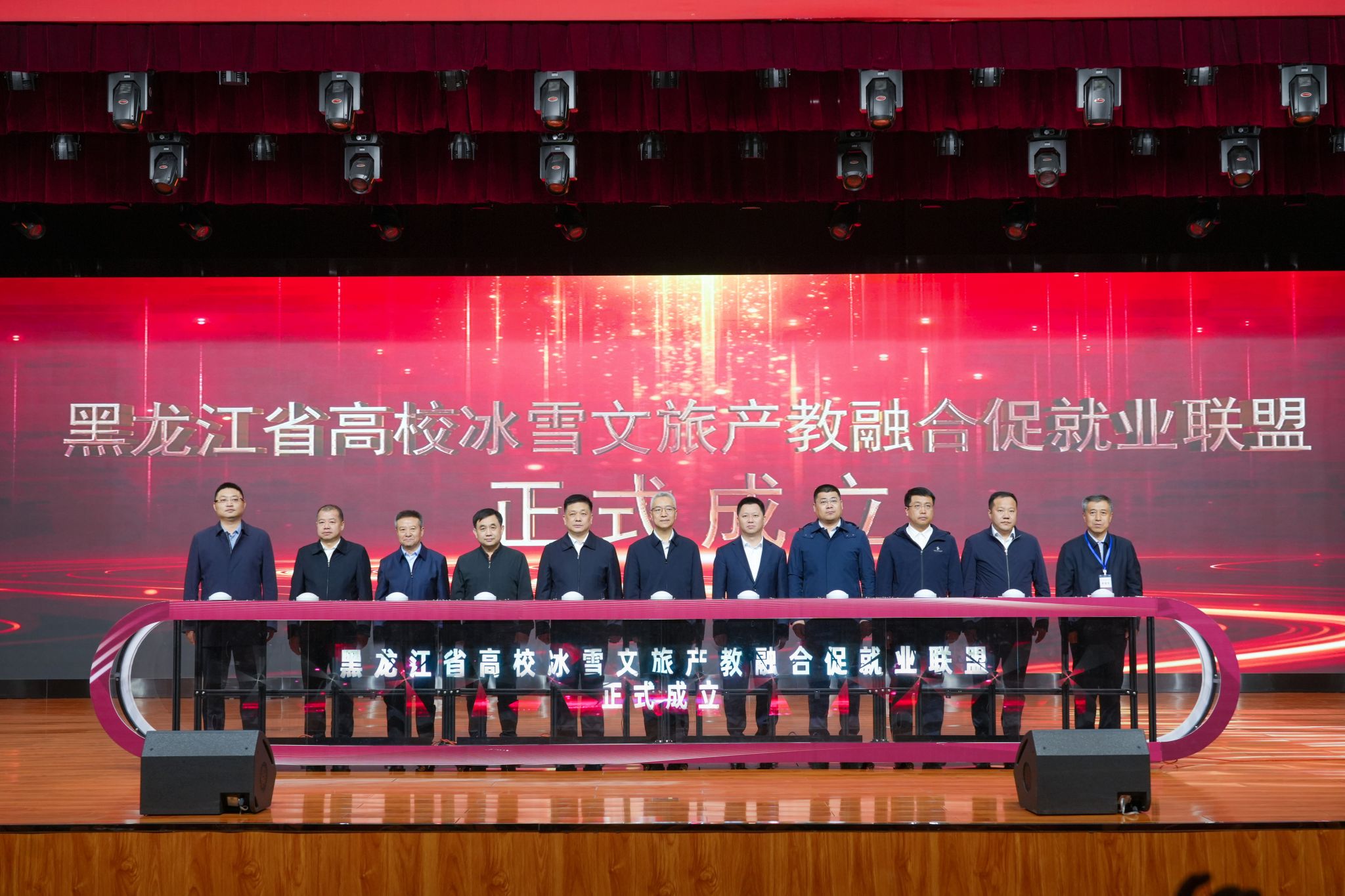 联盟大会上,举行了“黑龙江省高校冰雪文旅产教融合促就业联盟理事长单位”授牌和启动仪式,作为联盟大会成员单位,吴旭峰代表学校出席,与省教育厅、省文旅厅、兄弟高校及企业领导共同见证联盟成立。
