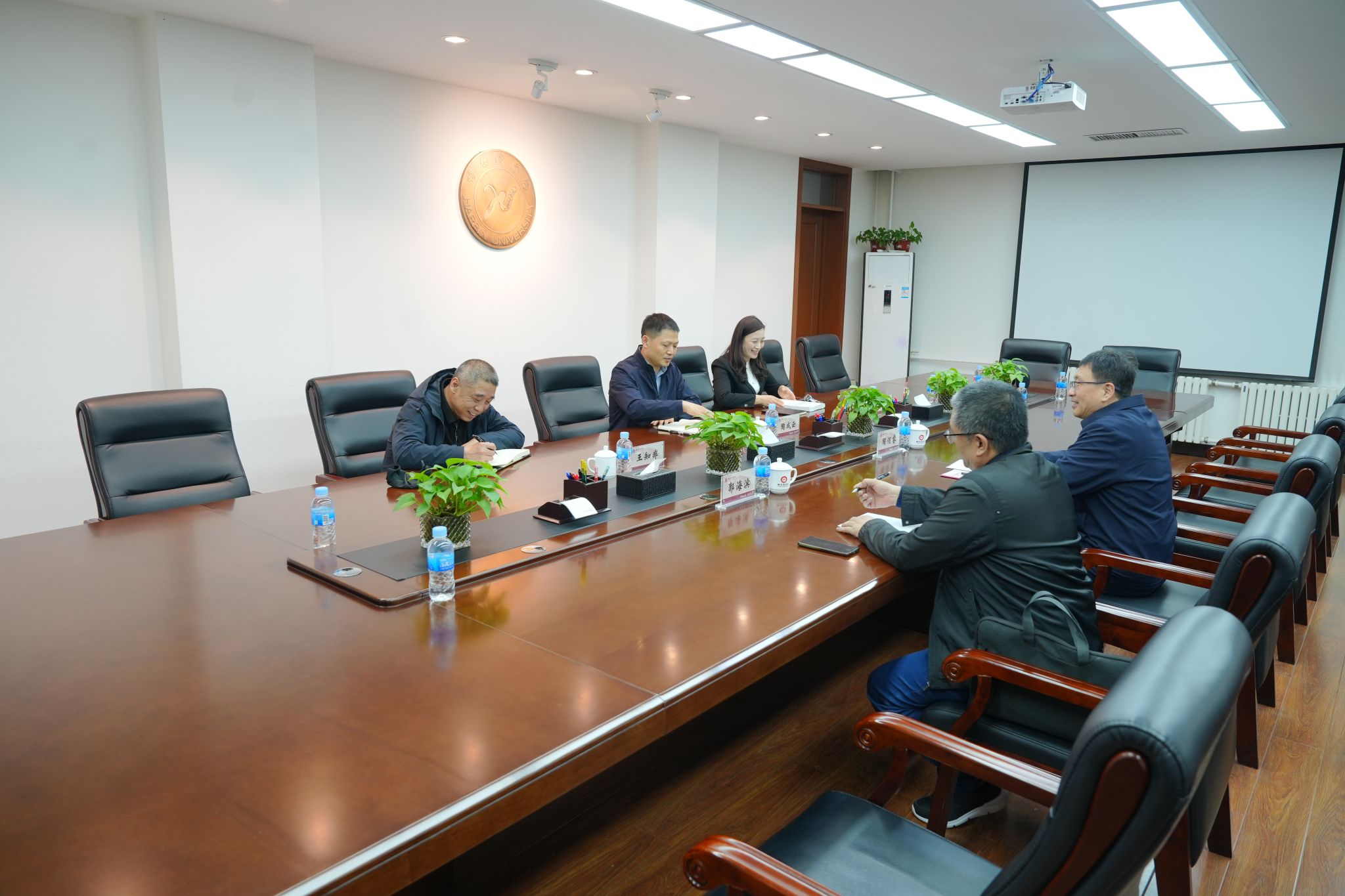 在党政办公楼306室召开的座谈会上,副校长陶成云、研究生处(学科办)处长苏冬妹、人工智能学院副院长王知非与来访团队开展深入研讨。陶成云重点分享申硕攻坚经验,围绕学科特色挖掘、高层次人才引育、科研成果孵化、研究生培养质量提升等申硕核心要素,详细介绍实践路径、突破策略,以及应对关键挑战的解决之道。