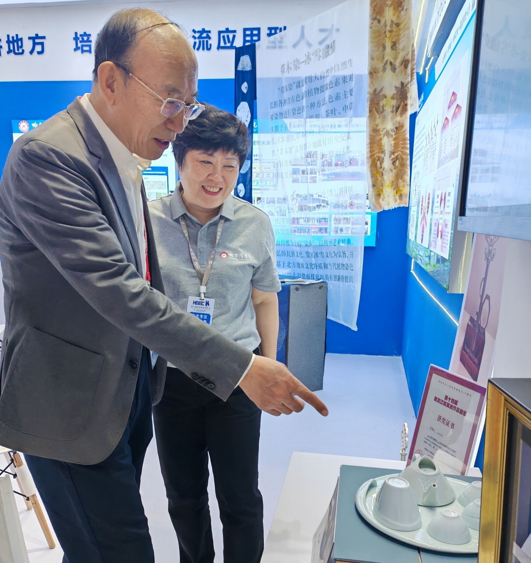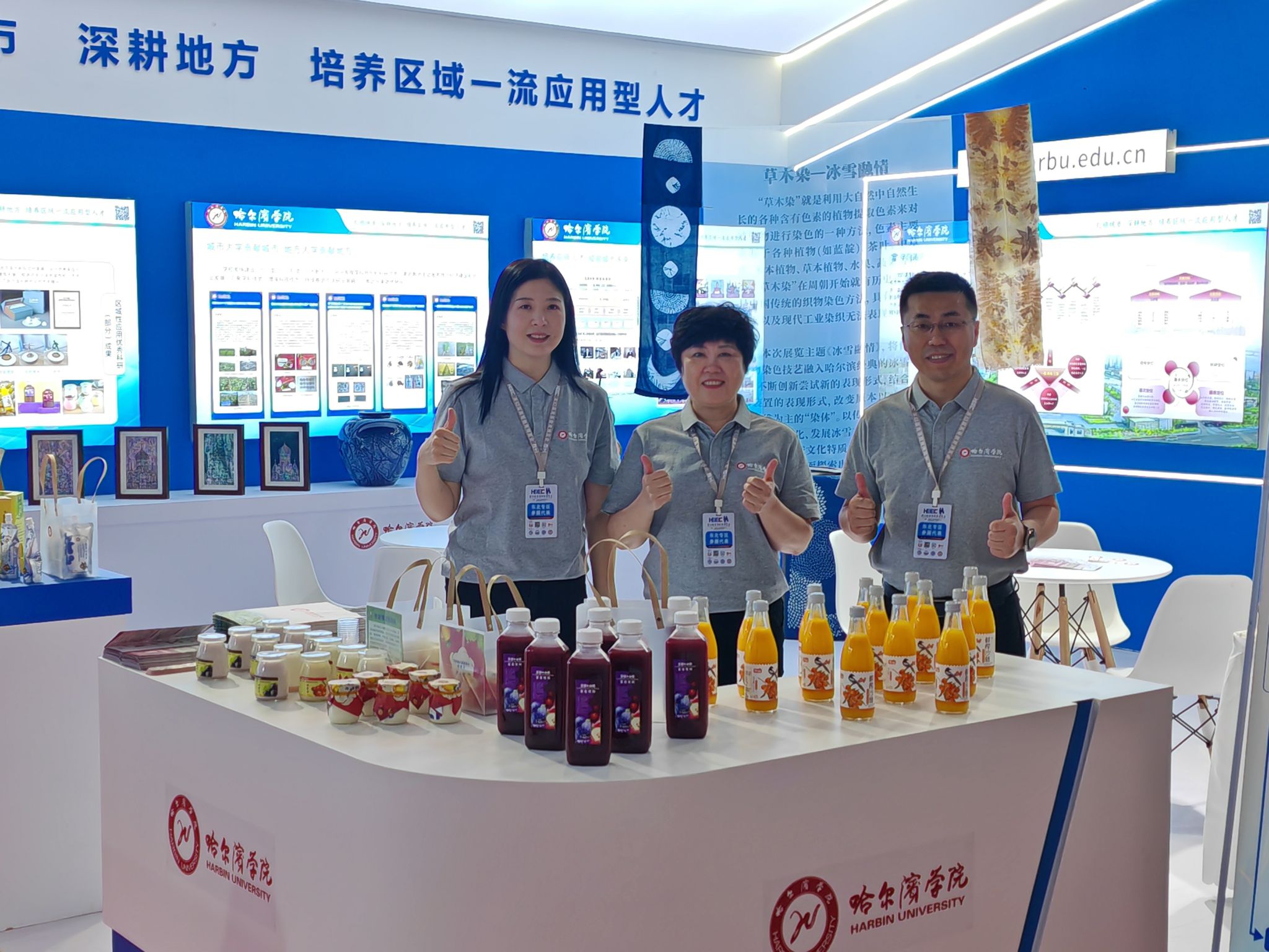 在东北振兴专区,我校以“扎根城市,服务地方,培养区域一流应用人才”为主题,对我校校城协同发展、开放式多样化办学格局,学校取得的优秀科研项目以及科技转化成果,包括艺术与设计学院的文创产品冰花瓷国礼、漆画、冰雪蓝染、哈尔滨大剧院望春壶、鱼皮画,食品工程学院的鲜榨沙棘、植物益生菌粉、龙江金樽白酒、蓝莓胶原蛋白肽饮料、各种口味酸奶等研发产品进行了图片、视频及实物展示,向参展高校与企业详细介绍我校食品工程领域的创新加工技术、工艺优化方案;艺术设计领域的特色文创产品、前沿设计理念,以及近年来在产学研用一体化育才、产教融合建设发展等方面取得的显著成就。