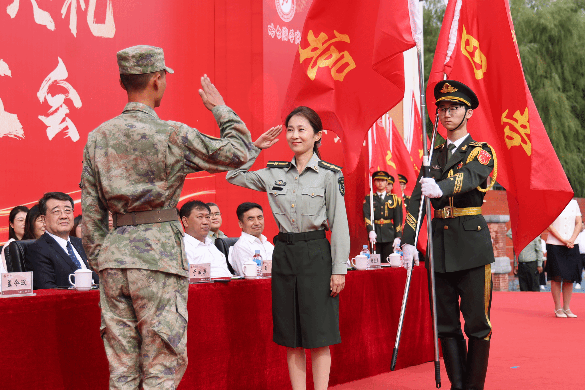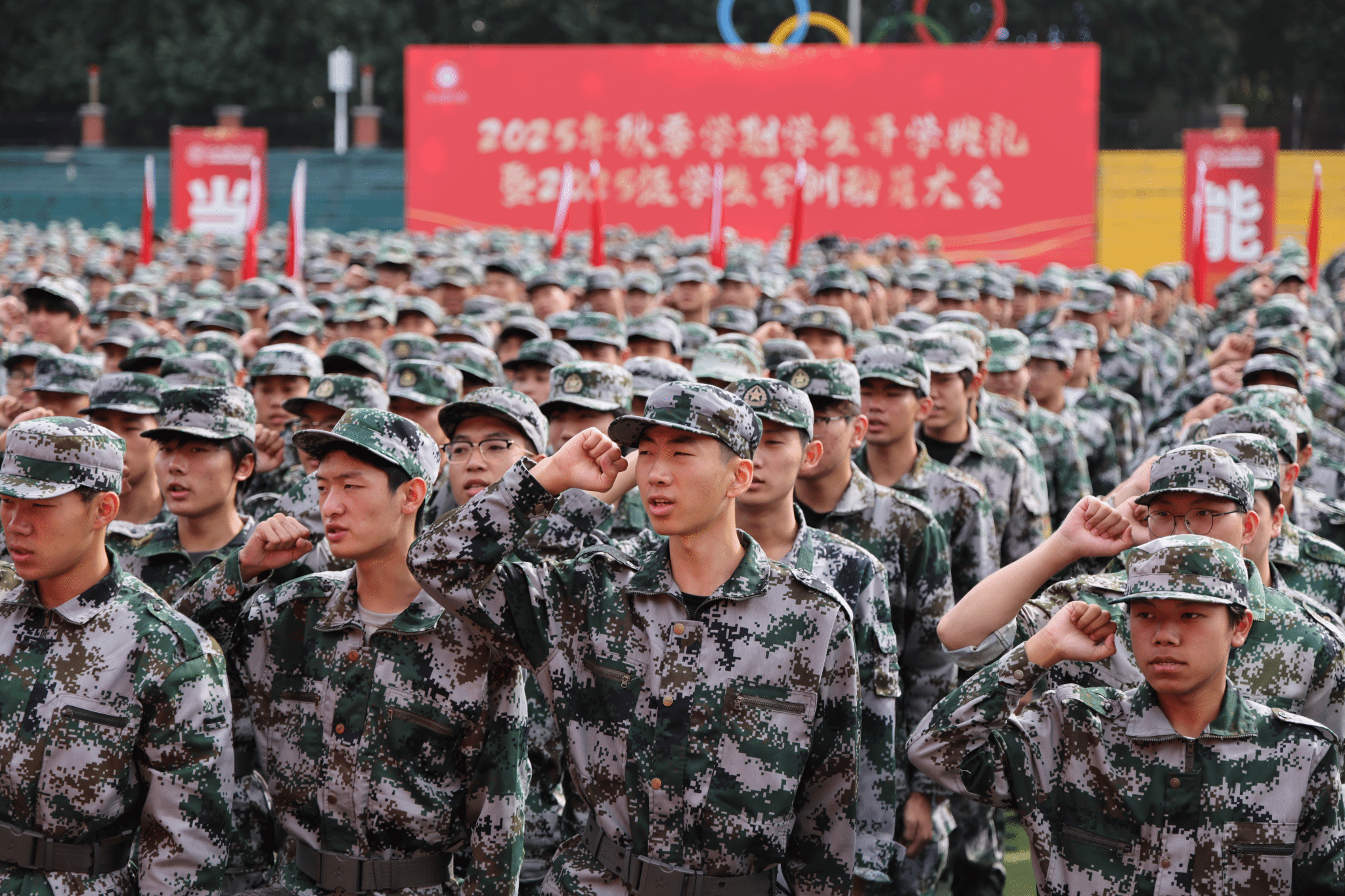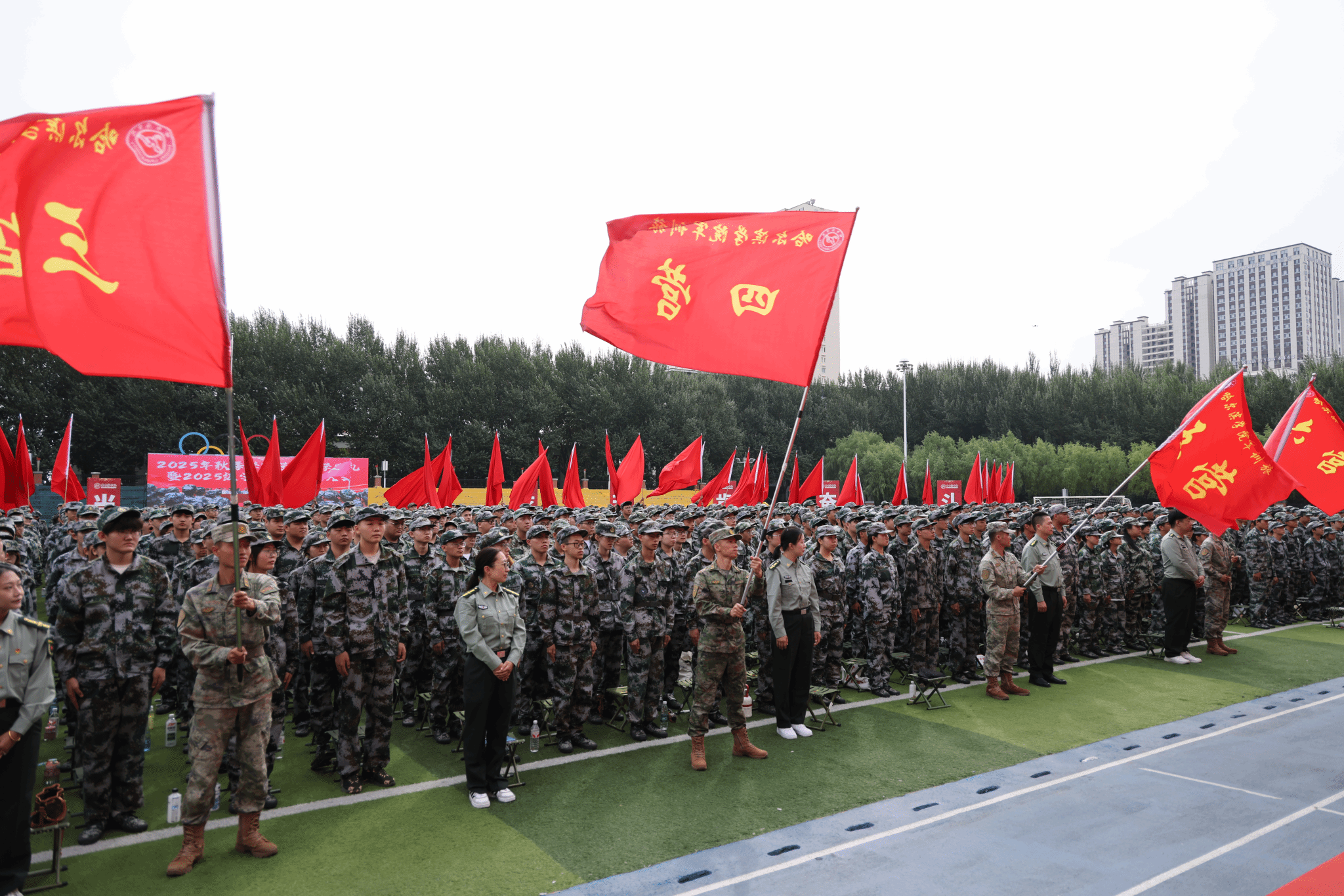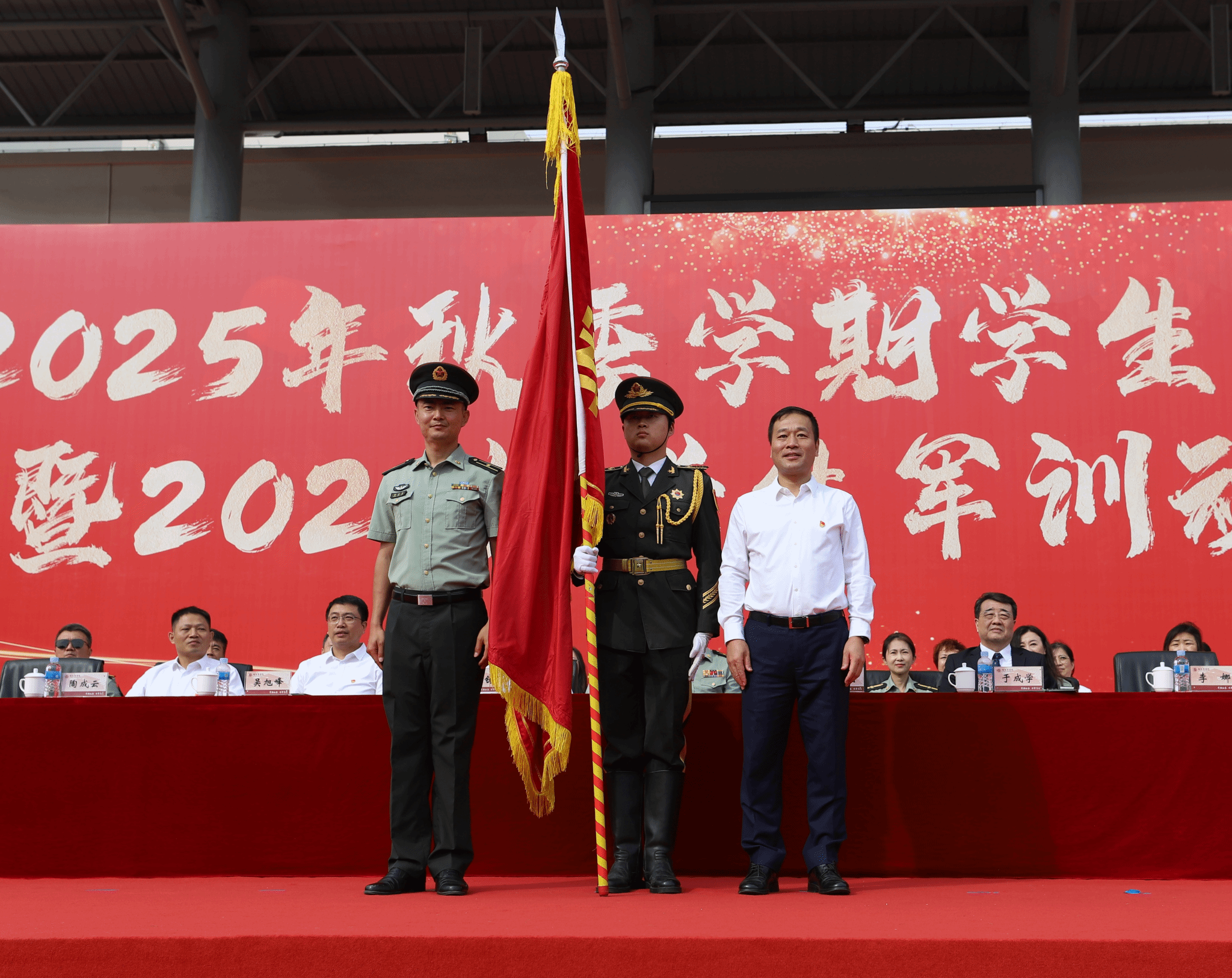 军训旅旅长于迪作军训动员并为十二个营授营旗。教务处处长姜艳丽宣读了国防教育教学要求。教官代表作表态发言,2025级全体新生庄严宣誓。