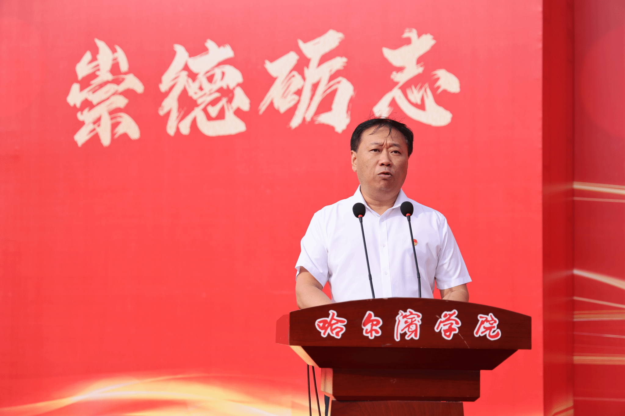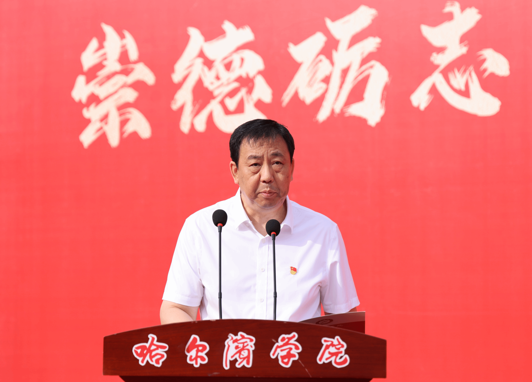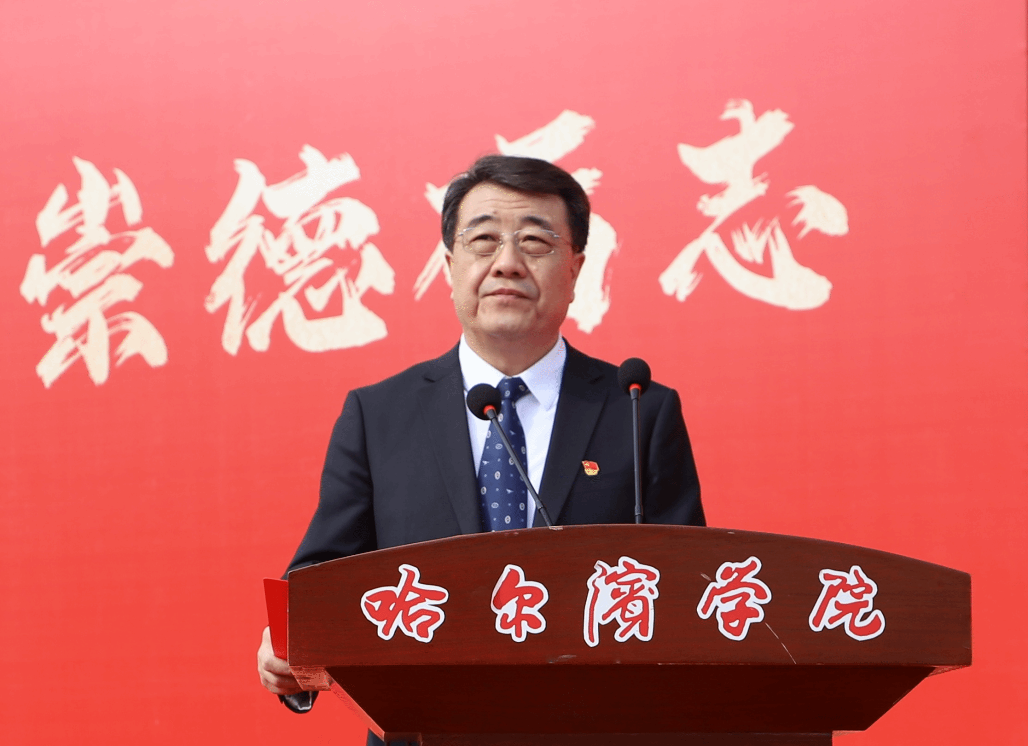孙钊为新生代表佩戴校徽。标志着2025级新生正式接过历史接力棒,肩负起传承哈院精神、担当时代使命的责任,开启同心同行、共创未来的新篇章。