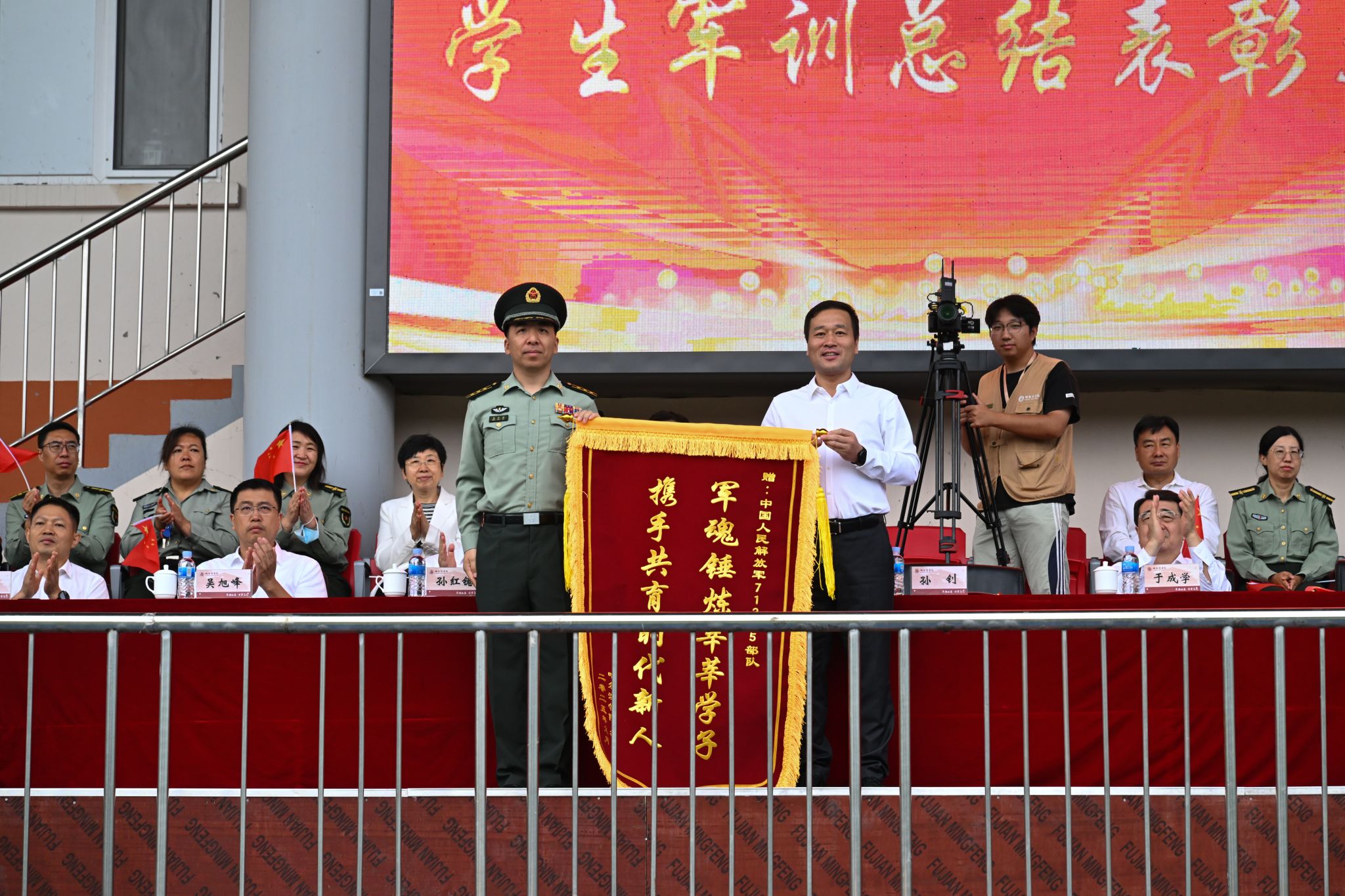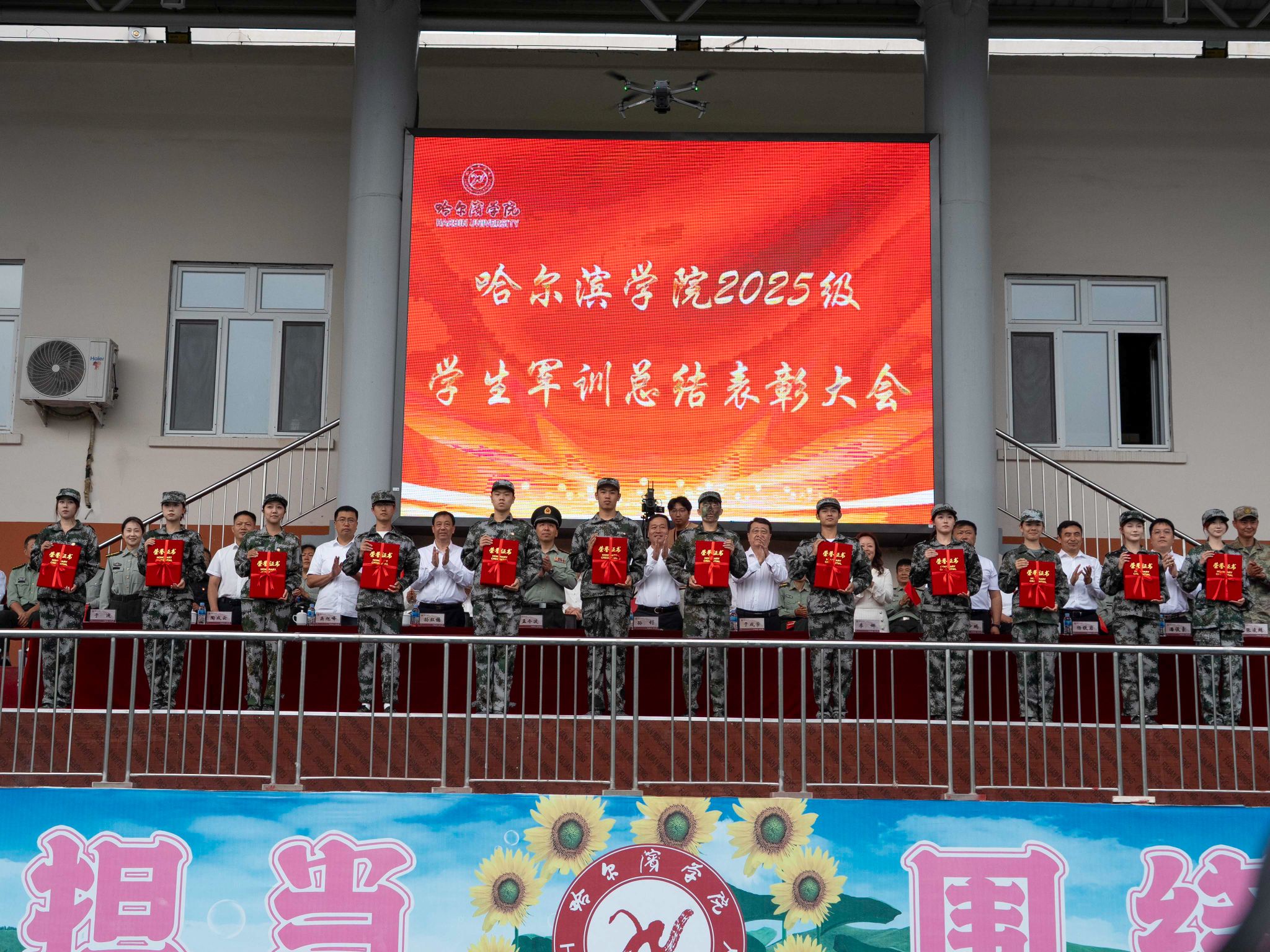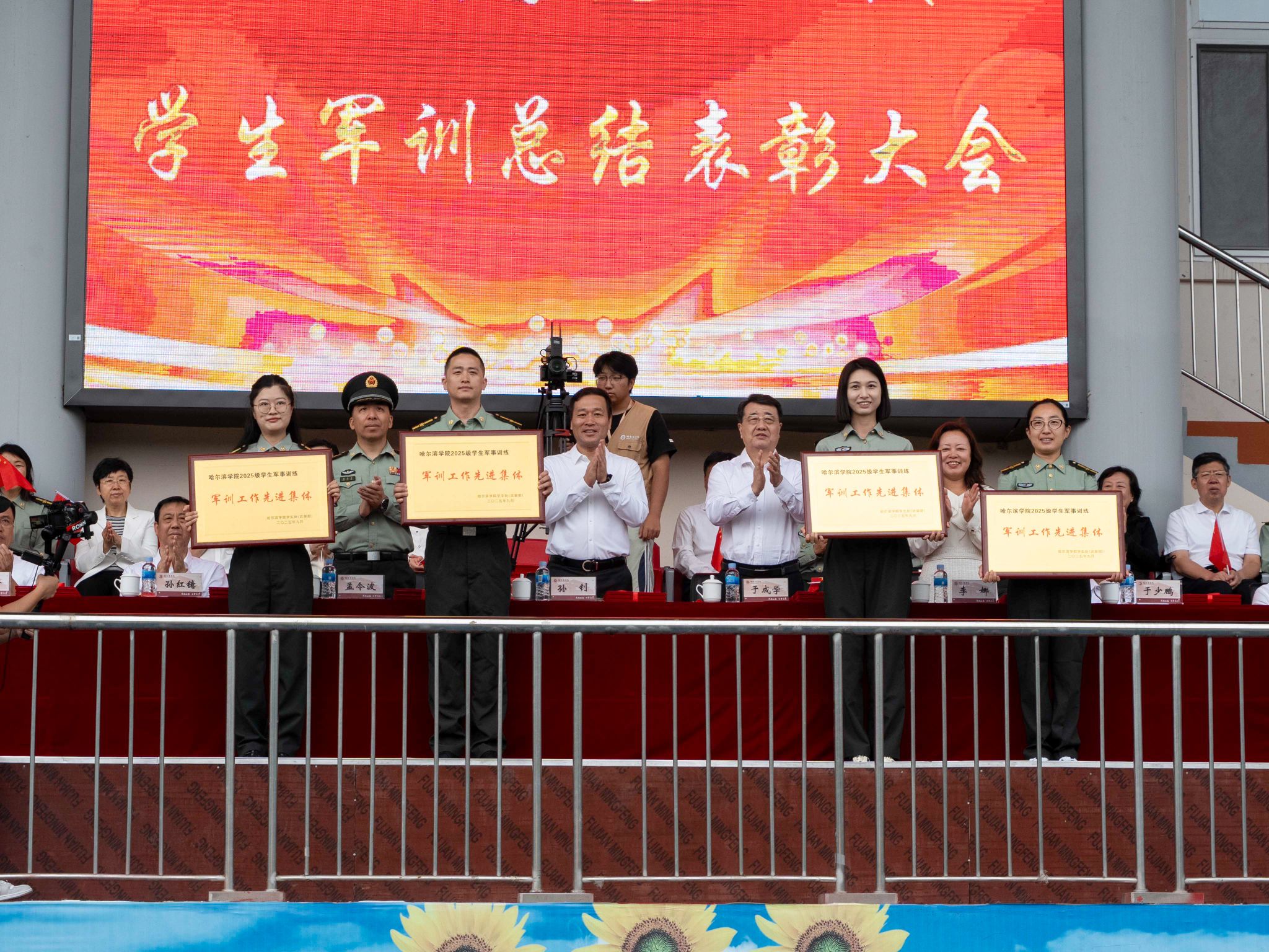 李娜宣读了《哈尔滨学院关于表彰2025级学生军训先进集体和先进个人的决定》。与会领导为获奖单位及个人代表颁发奖牌和荣誉证书。