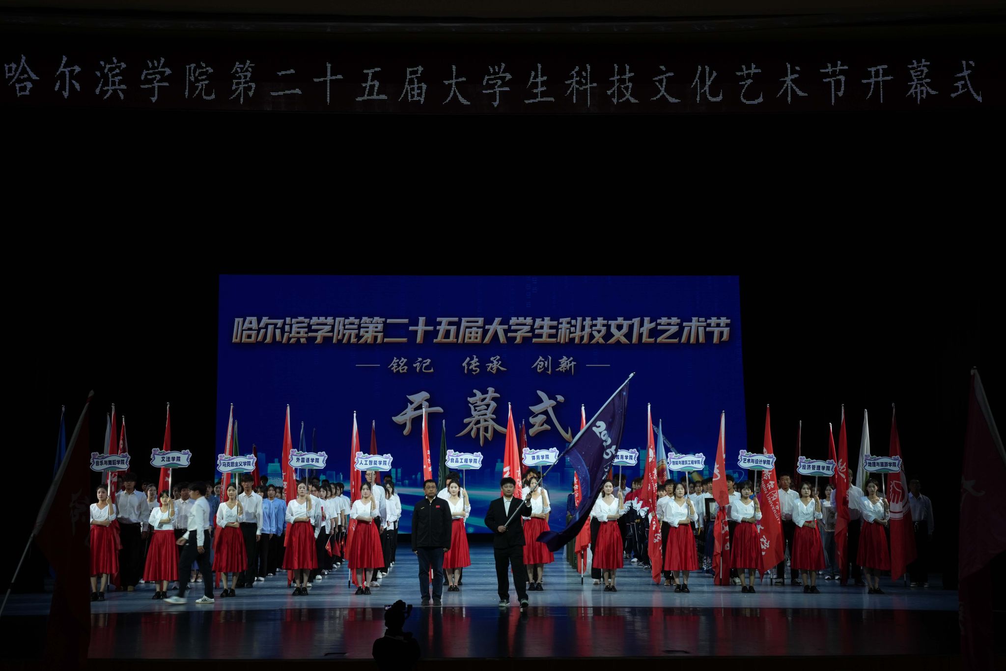 本届艺术节以“铭记·传承·创新”为主题,立足立德树人根本任务,深入挖掘各学院文化品牌特色,全面展示育人成果与文化底蕴。开幕式上,各学院院旗、校级学生组织会旗及品牌社团团旗依次入场,彰显哈院学子团结奋进、锐意进取的青春风采。副校长吴旭峰为本届大学生科技文化艺术节授旗,标志着活动正式启动。