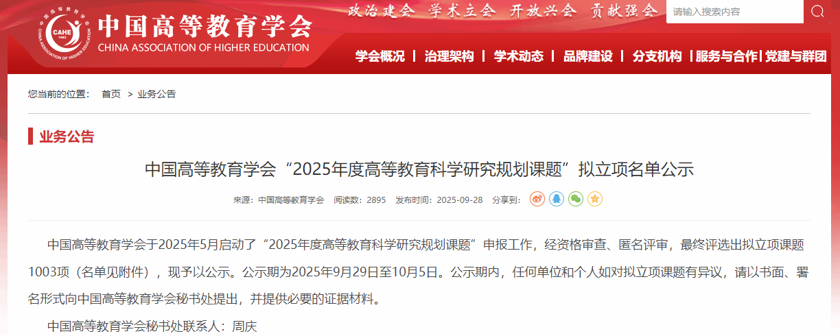 我校获批中国高等教育学会“2025年度高等教育科学研究规划课题”一览表