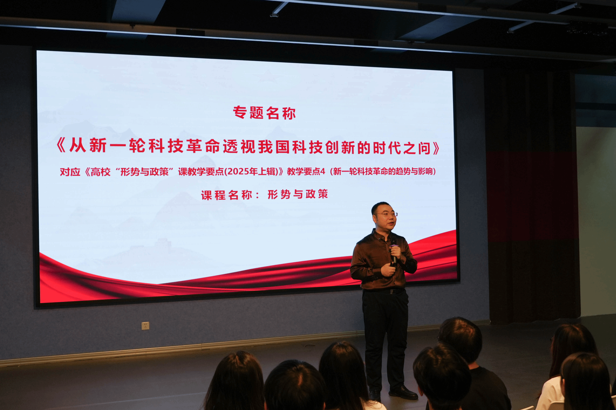 在教学展示环节,两位巡讲教师围绕不同思政课程主题,呈现了两场兼具思想性与实践性的示范课堂。来自哈尔滨工业大学的何家旭老师在《形势与政策》课中,以《从新一轮科技革命透视我国科技创新的时代之问》为题作展示教学。何老师从“4个趋势、3个影响、2个挑战、1项制度”角度讲述了新一轮科技革命的发展趋势与多维影响,以及我国应对新一轮科技革命的挑战与破局路径,将科技革命转化为青年可感的教学内容,实现了时政热点与价值引领的深度融合。