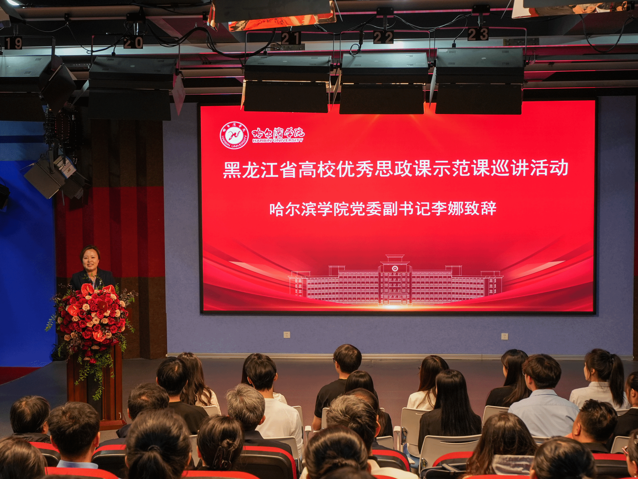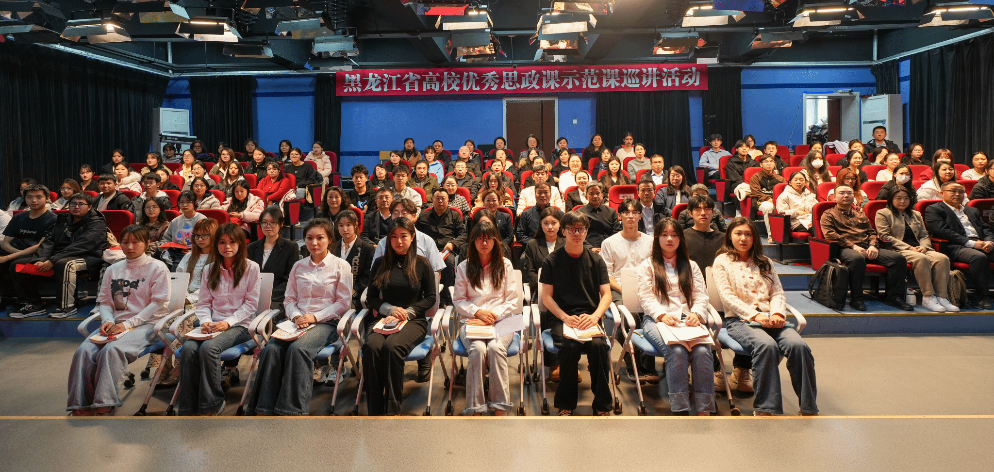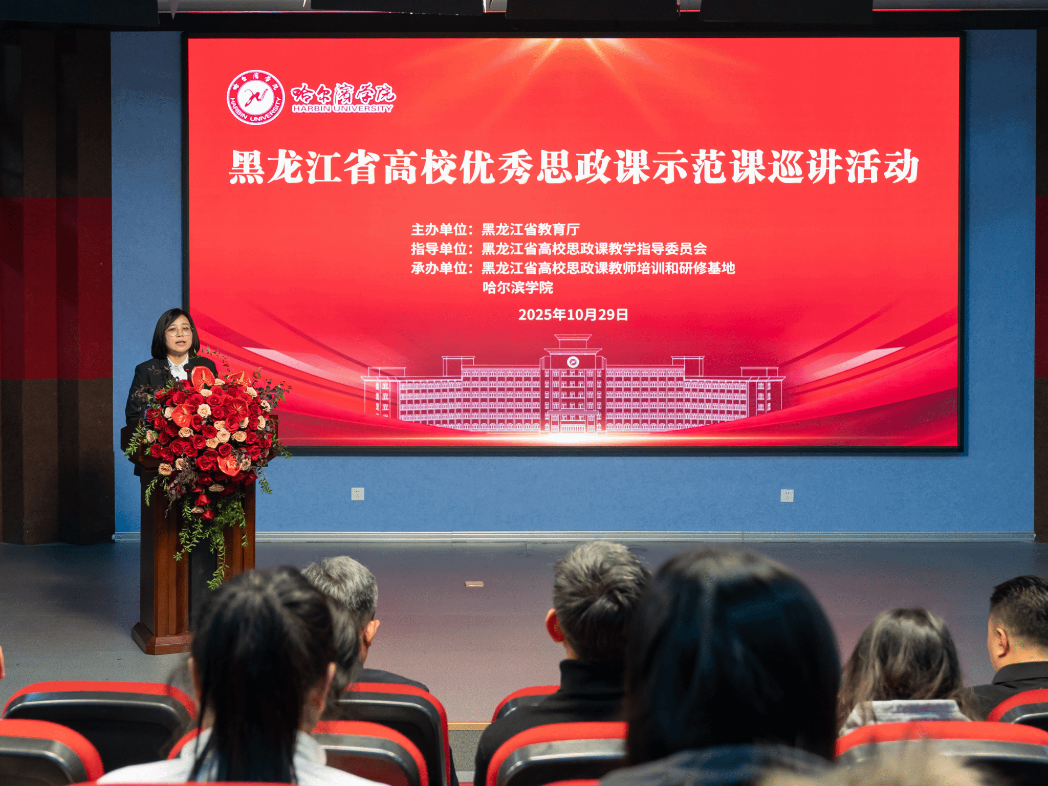 黑龙江省高校优秀思政课示范课巡讲活动,是省教育厅落实《普通高校思政课教师队伍建设规划(2025-2027年)》的重要举措,旨在通过优质课程示范、校际经验交流,提升高校思政课教师教学能力,推动龙江高校思政课建设内涵式发展,持续为思政课建设注入新动能。哈尔滨工业大学、哈尔滨理工大学、黑龙江职业学院、黑龙江农业工程职业学院、哈尔滨北方航空职业技术学院、哈尔滨传媒职业学院、哈尔滨应用职业技术学院等高校的思政课教师代表、哈尔滨学院马克思主义学院全体教师及学生代表参加了此次巡讲活动。