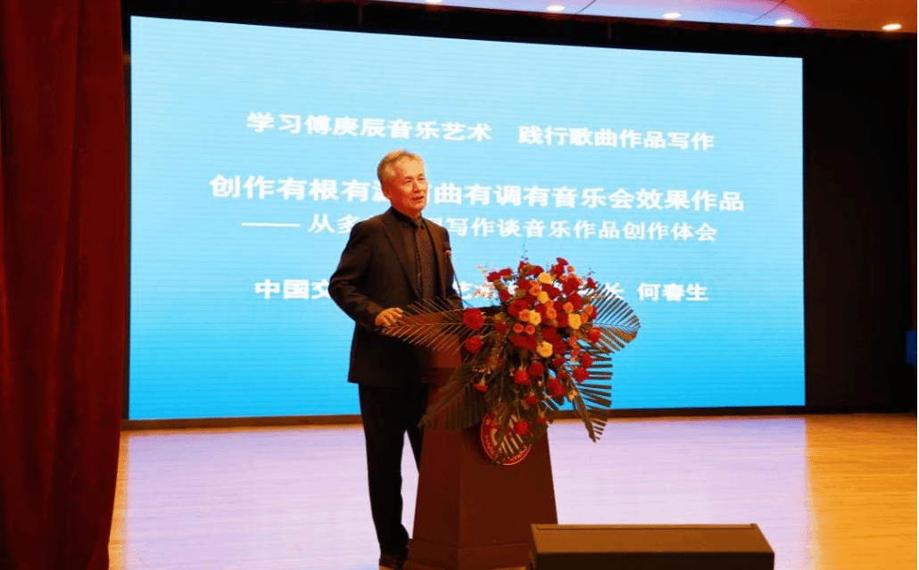 (文/崔雪花)为认真贯彻落实习近平文化思想,充分发挥红色音乐铸魂育人作用,彰显红色文化的时代价值,着力构建以“东北抗联精神”为引领的红色文化育人体系,11月13日下午,学校音乐与舞蹈学院邀请中国交响音乐季艺术中心秘书长何春生在小音乐厅为全院师生做《学习傅庚辰音乐艺术 践行歌曲作品写作——创作有根有源有曲有调有音乐会效果作品》专题讲座。哈尔滨学院党委副书记李娜、哈尔滨城史文物馆馆长杨伟东、科技处副处长刘群、文法学院院长周晓燕、音乐与舞蹈学院班子成员及师生代表参会。讲座由音乐与舞蹈学院副院长崔雪花主持。