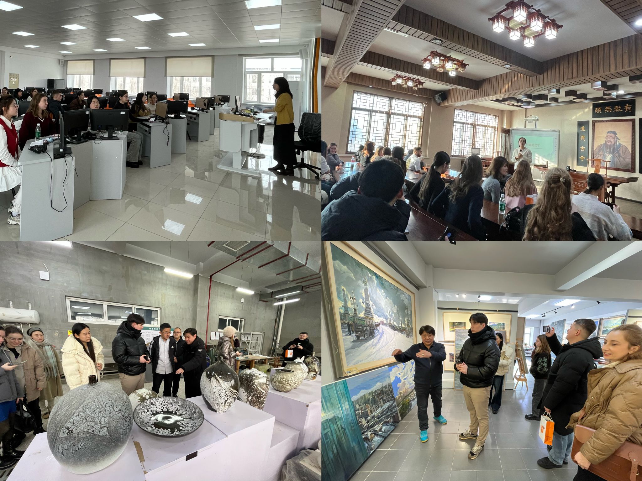 俄罗斯师生研学团参加了外国语学院宋佳美老师为俄罗斯学生开设的“龙江冰城冰雪魅力”主题体验课程,充分领略到黑龙江省哈尔滨市独特冰雪文化的魅力。代表团参观了学校艺术实验中心,学习了解冰花瓷的制作工艺、文化内涵以及艺术价值,共同走进哈尔滨油画百年来发展历程,体会艺术成就。在中华传统文化体验环节,外国语学院李玫老师为代表团学生系统地讲解了汉字的起源与演变。之后,学生们在文法学院付伟刚、刘宁等老师的指导下,亲身参与中国书法、民间剪纸和民族歌舞等三项传统文化活动课程,现场氛围热烈,互动积极踊跃。