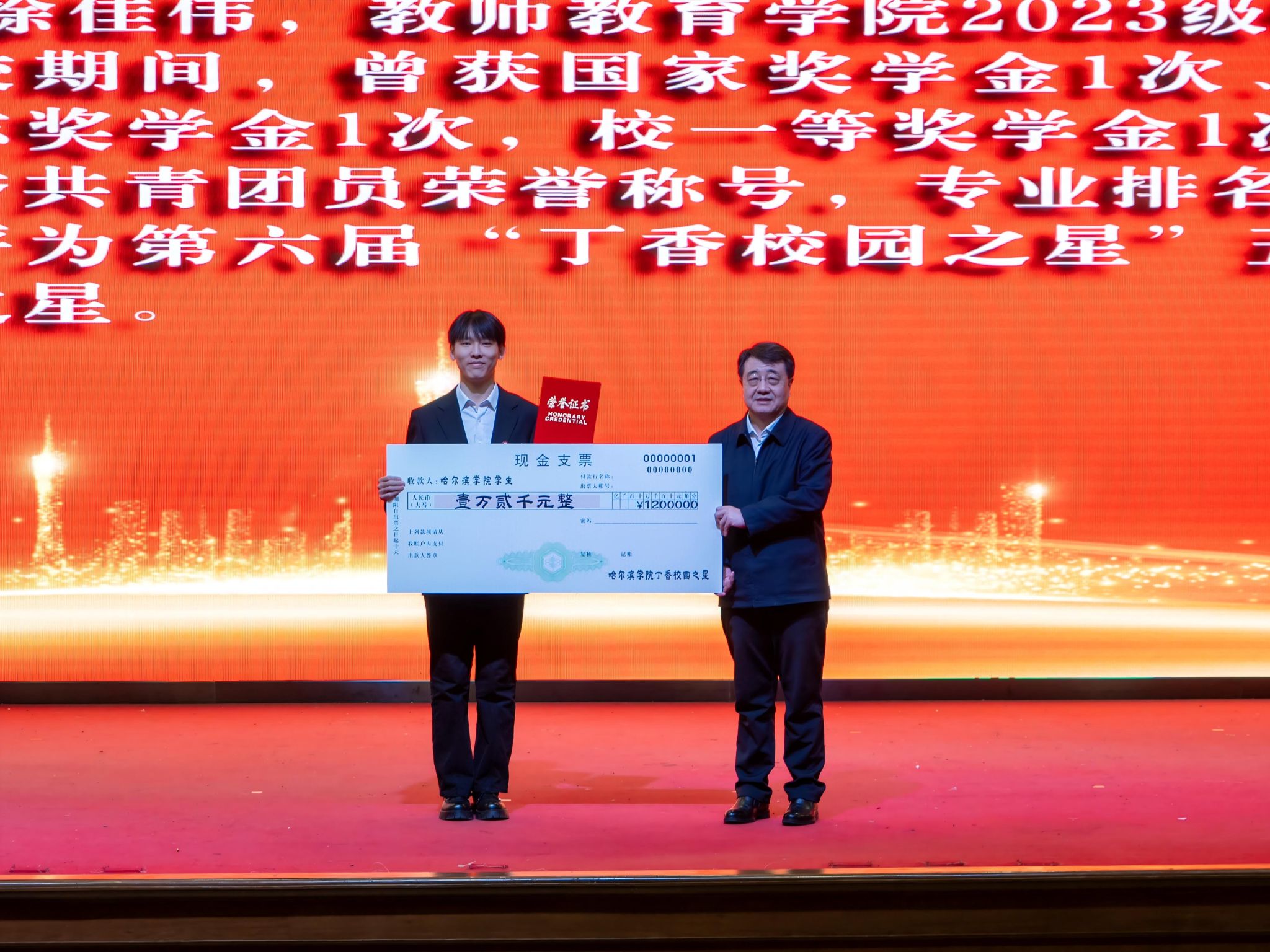 于成学为“丁香校园之星”获奖个人颁奖,表彰在德、智、体、美、劳各方面表现突出、具有示范引领作用的青年榜样。