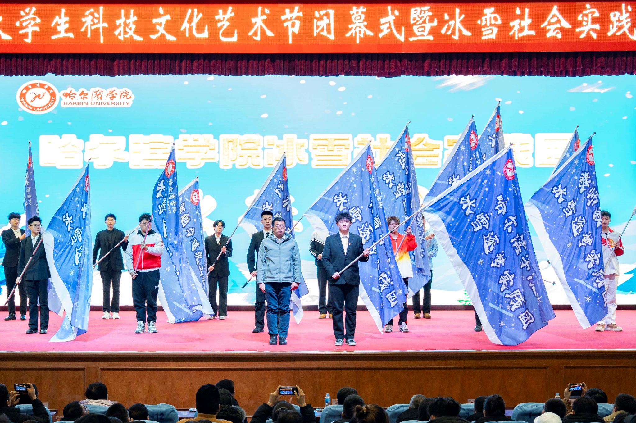 闭幕式现场举行了冰雪社会实践团出征仪式。马克思主义学院刘思博同学作为学生志愿者代表发言,表达了投身社会实践、服务国家战略、助力龙江发展的坚定决心。吴旭峰向实践团授旗,标志着冰雪社会实践团正式启航。歌声嘹亮,誓言铮铮,伴随着师生合唱曲目《强国一代有我在》的悠扬旋律,闭幕式落下帷幕。