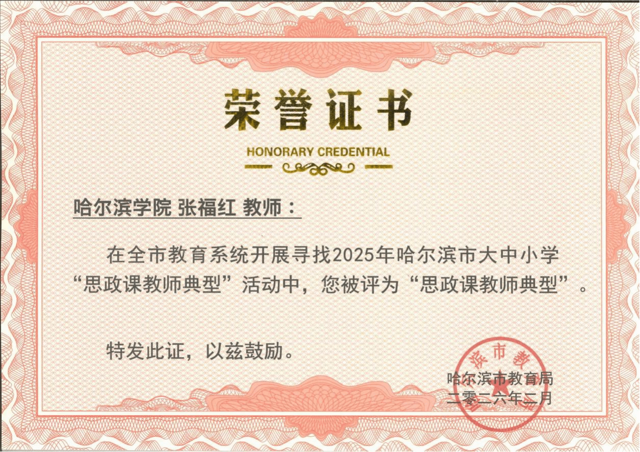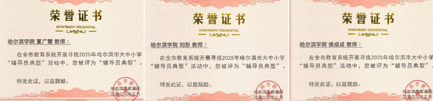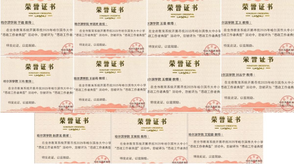 近日,中共哈尔滨市委教育工委、哈尔滨市教育局公布了2025年哈尔滨市大中小学“思政课教师典型”“思政工作者典型”“辅导员典型”评选结果。我校共有15名教职工入选,其中思政课教师典型1人、思政工作者典型11人、辅导员典型3人,充分展现了学校思想政治工作和师德师风建设的扎实成效。