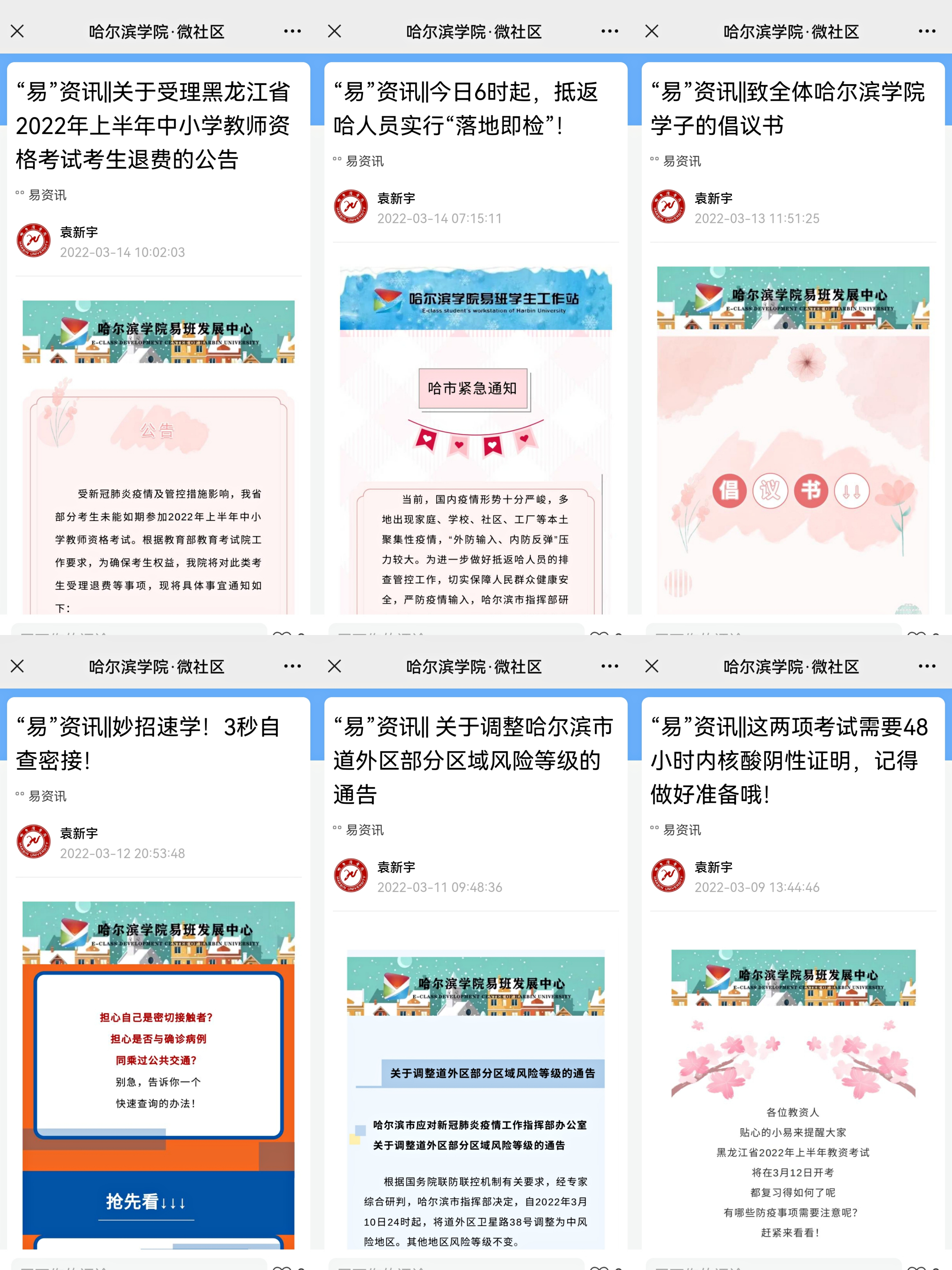 依托易班网络平台汇集疫情防控信息,制作“学生返校指引视频”1个,“返校指引标识牌”8块、“疫情防控小贴士”6块,“一图看懂|返校须知”1个;转发“全国每日疫情动态”15篇、“哈尔滨市进出管控措施”3篇;制作、转发“这两项考试需要48小时内核酸阴性证明,记得做好准备哦!”“妙招速学!3秒自查密接”“致全体哈尔滨学院学子的倡议书”等微推,共50篇,抖音视频13条,推送微博18条,视频号6条,累积点击量5.1万余次,持续普及疫情防控知识,加强疫情防控能力。