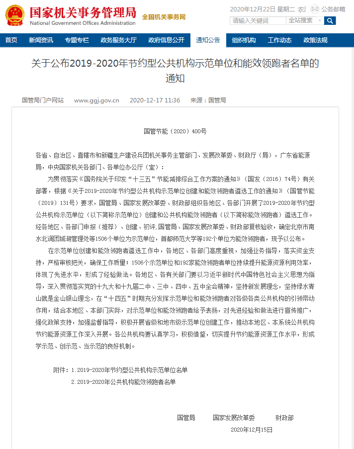 12月17日,国家机关事务管理局、国家发展和改革委员会、财政部共同发布了2019-2020年节约型公共机构示范单位名单,哈尔滨学院榜上有名,荣获“全国公共机构能效领跑者”称号。据悉,全省仅6家单位获此项荣誉称号。本次是继2019年我校获评“教育部学校规划建设发展中心能效领跑者优秀建设项目”之后的又一项殊荣,经历了申报、创建、初评、公示和复核评价验收等环节,最终脱颖而出,成为黑龙江省唯一入围榜单的高等院校。