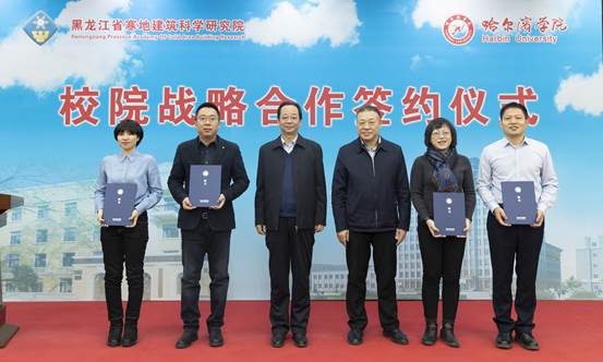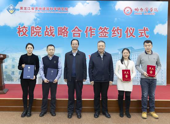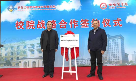 签约仪式上,省寒地建科院院长李若冰和校长胡宝忠签署了校院战略合作协议书;省寒地建科院院长李若冰和学校党委书记冯延平为双方合作建立的“黑龙江寒地绿色城区设计研究中心”揭牌;省寒地建科院院长李若冰和校长胡宝忠分别为黑龙江寒地绿色城区设计研究中心主任和学术委员会代表、哈尔滨学院客座教授、省寒地建科院特聘专家颁发了聘书。