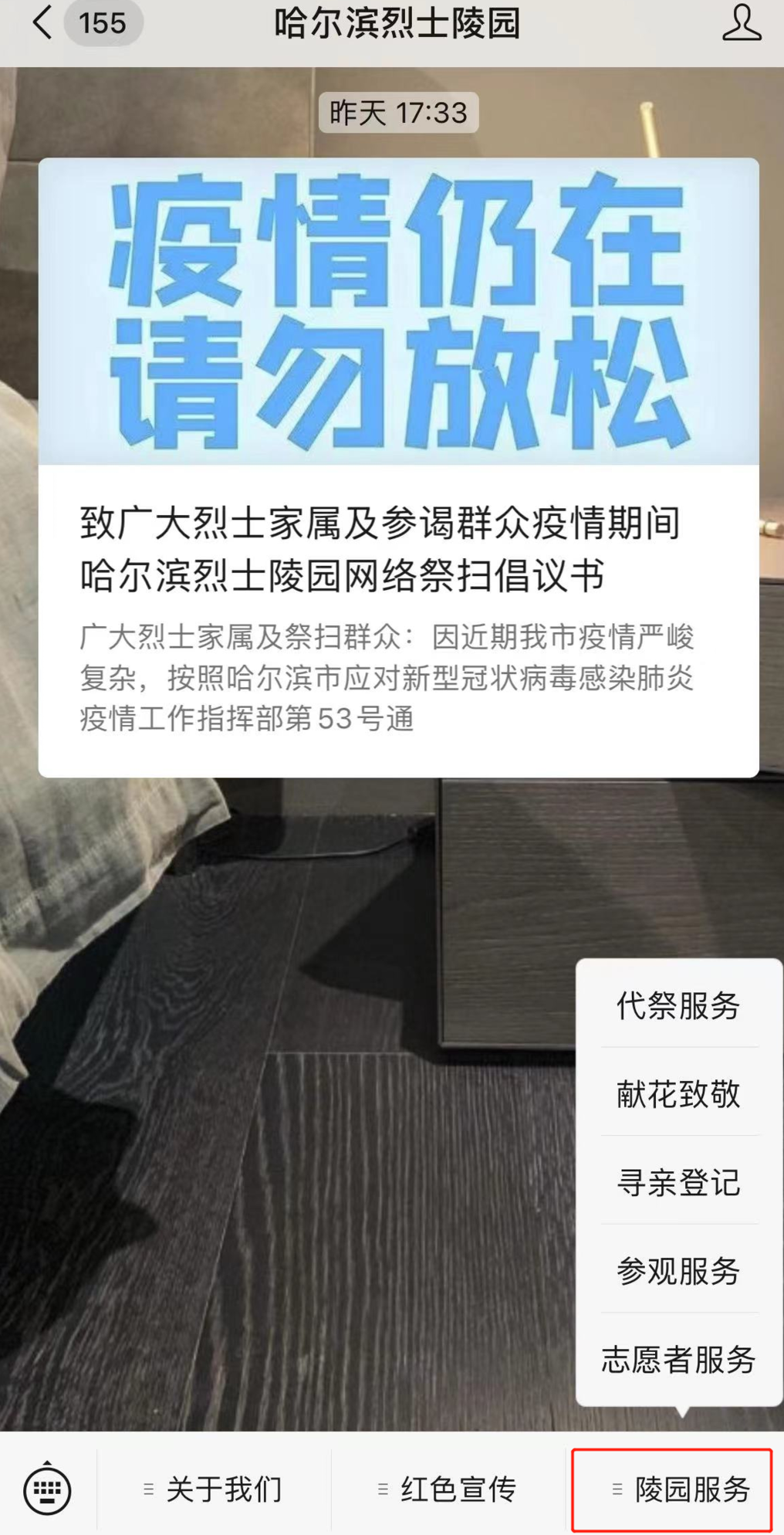 方法3:关注哈尔滨烈士陵园微信公众号,①点击陵园服务→点击进入全体祭祀→点击右侧添加祭品并鞠躬;②点击陵园服务→进入烈士纪念堂→学习烈士生平事迹→点击图标为烈士祈福留言→点击祭拜添加祭品并鞠躬。