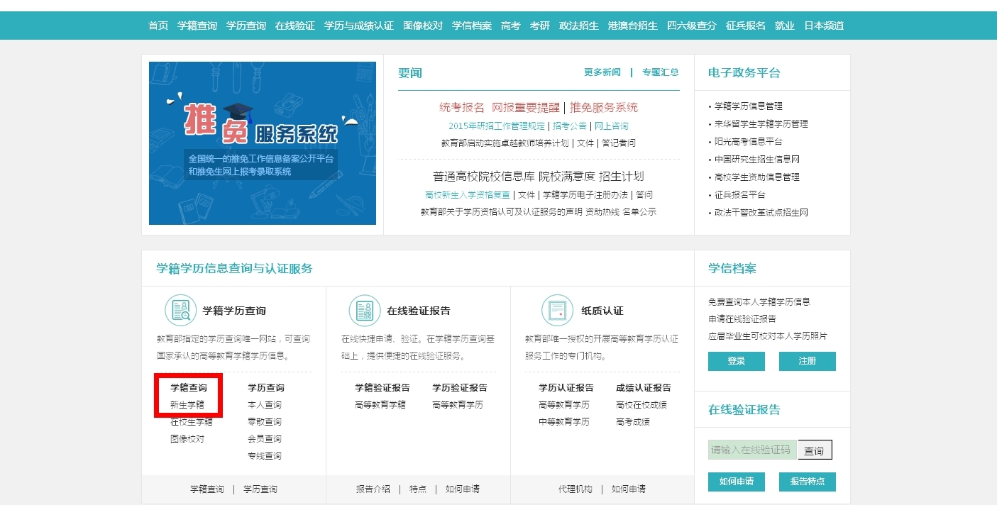 二、在学籍学历查询栏目下点击新生学籍,进行实名注册(注:请妥善记好账号和密码,进行学籍查询)。