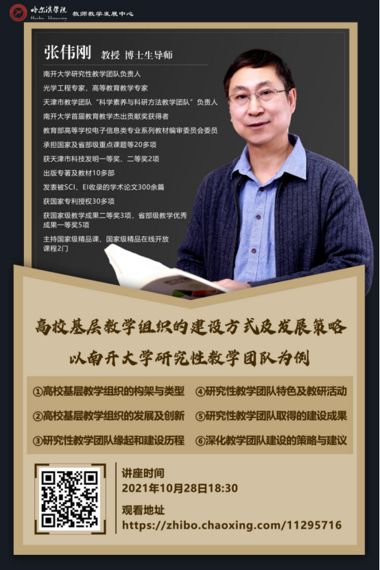 教师教学发展中心特邀请南开大学张伟刚教授以《高校基层教学组织的建设方式及发展策略》为题,作专题报告。欢迎各位老师踊跃参加!