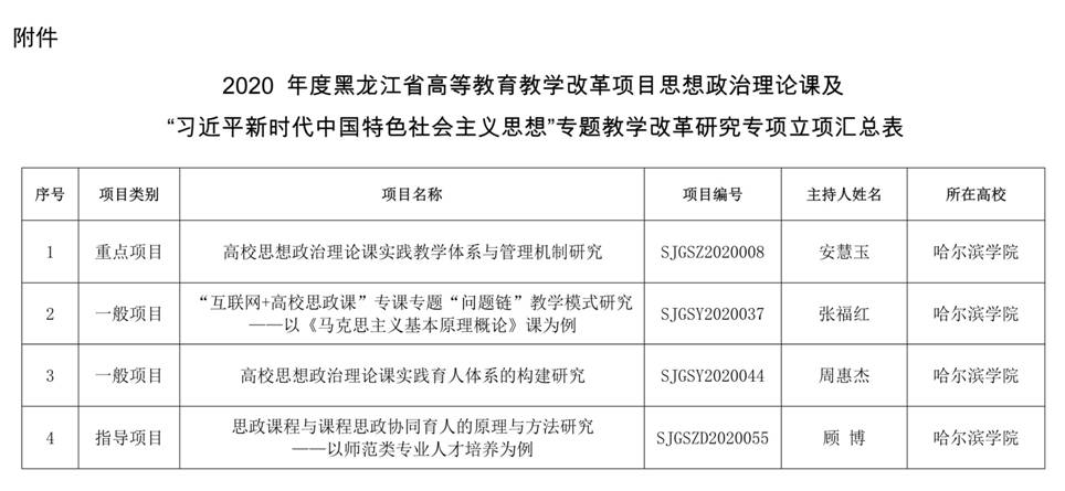 按照《黑龙江省教育厅关于 2020 年度黑龙江省高等教育教学改革项目思想政治理论课及“习近平新时代中国特色社会主义思想”专题教学改革研究专项申报工作的通知》(黑教思函〔2020〕 258 号)要求,省教育厅组织了 2020 年度黑龙江省高等教育教学改革项目思想政治理论课及“习近平新时代中国特色社会主义思想”专题教学改革研究专项立项工作,经专家组评审和结果公示无异议,我校共获批 2020 年度黑龙江省高等教育教学改革项目思想政治理论课及“习近平新时代中国特色社会主义思想”专题教学改革研究专项重点项目1 项、一般项目2项、指导项目1项。具体详见附表: