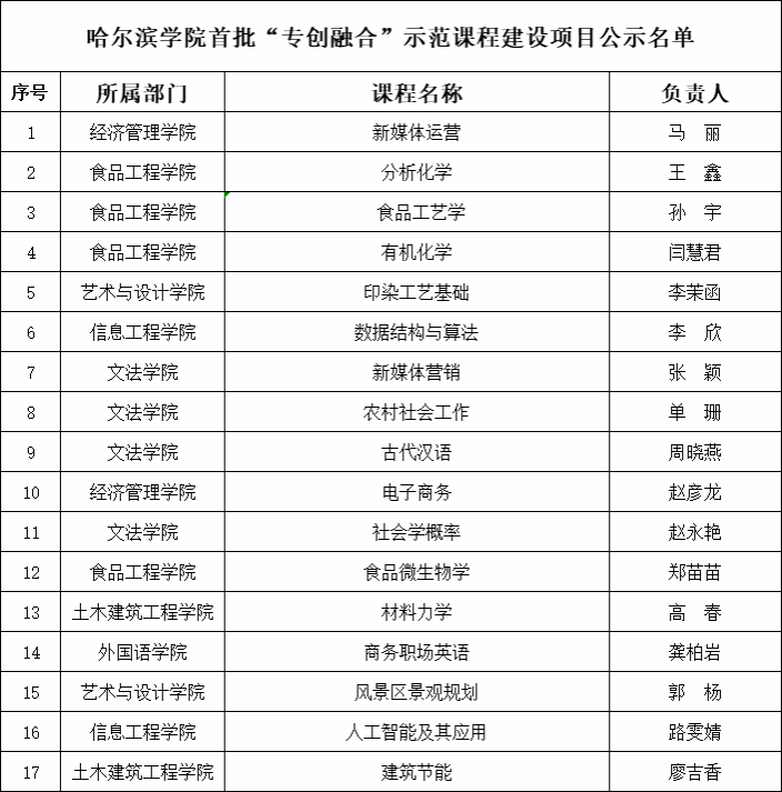 根据我校《关于组织遴选哈尔滨学院首批“专创融合”示范课程建设项目的通知》,学校组织“专创融合”示范课程建设项目评审专家组,依照“专创融合”示范课程项目的建设要求与申报条件,对各学院申报的23个项目进行了综合评审和评议,确定下列17门课程为我校首批“专创融合”示范课程建设项目(详见附表,公示名单按负责人姓氏笔画为序)。请获批立项的各门课程负责人积极做好课程教学改革设计,做到创新创业教育与专业知识有机融合,充分发挥课程“专创融合”功能,保证“专创融合”示范课程建设项目如期开展。各学院应高度关注“专创融合”示范课程建设,给予大力支持,确保这项工作高质量完成。