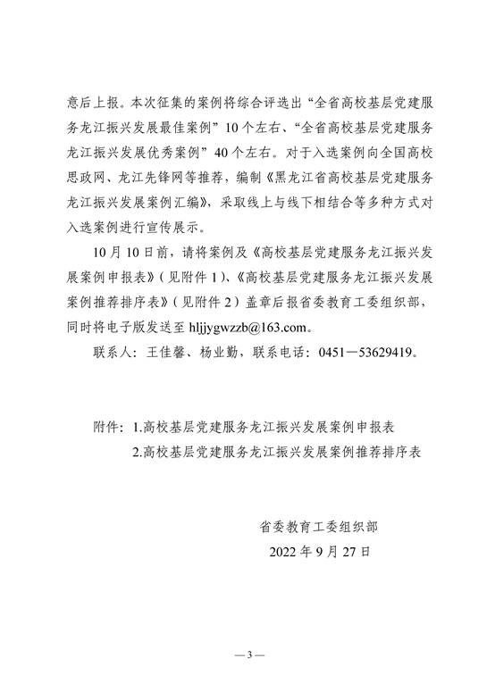 请于10月7日前将附件中的《高校基层党建服务龙江振兴发展案例申报表》和案例电子版发送至组织部邮箱:hrbxyzzb@163.com,联系电话:86612673。
