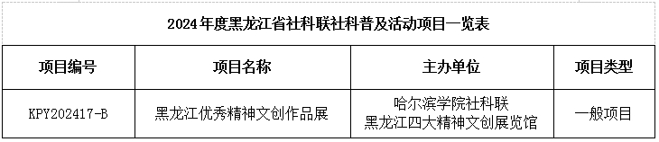 (文/杨梓桐)为深入学习贯彻党的二十届三中全会精神,落实《黑龙江省哲学社会科学普及条例》,提高对科普工作重要性的认识,强化全社会科普责任,加强科普能力建设,传承中华优秀传统、弘扬龙江优秀精神和地域特色文化,省社科联开展了2024年社科普及活动项目评选工作,科技处积极组织我校黑龙江四大精神文创展览馆策划举办社科普及活动并申报。近日,项目评选结果揭晓,我校黑龙江四大精神文创展览馆申报的社科普及活动获批立项。