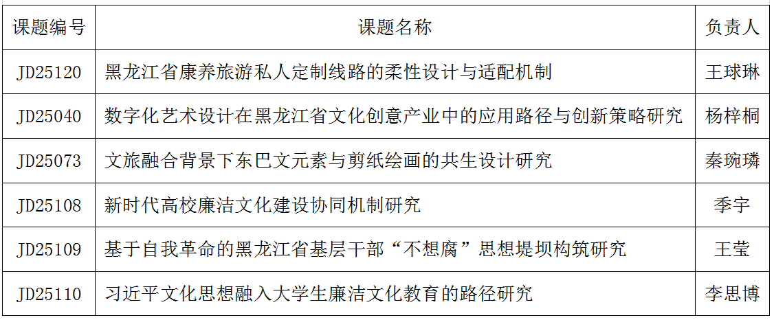近日,2025年度黑龙江省经济社会发展重点研究课题(基地专项)立项结果公布。经全省招标、专家评审、省社科联审定,我校共有6项课题获批立项,研究领域涵盖康养旅游、数字艺术、文旅融合、廉洁文化建设等多个方面。此次课题的成功获批,对我校相关学科发展、提升智库服务能力、助力龙江全面振兴起到助推作用,展现了我校在服务地方经济社会发展与文化建设方面的综合科研能力,促动我校教师力争产出一批具有理论价值和实践意义的优秀成果,为黑龙江省经济社会发展贡献智慧与力量。