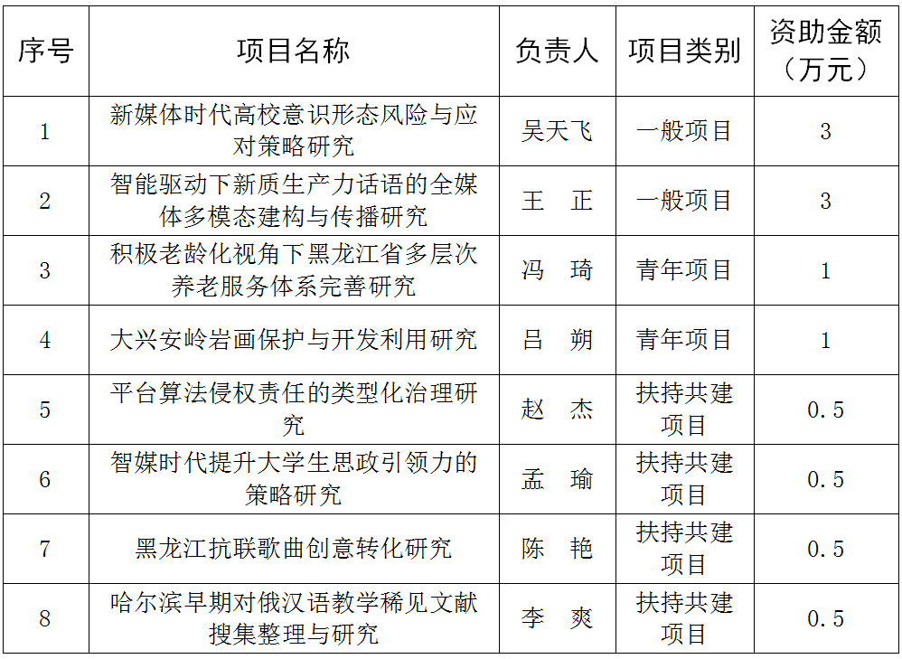 通知公告 首页 - 通知公告 - 正文 我校获批2025年度黑龙江省哲学社会科学研究规划项目8项 浏览量:时间:2025-11-10 2025年度黑龙江省哲学社会科学研究规划项目评选结果近日揭晓,我校共获批立项8项。其中,一般项目2项、青年项目2项、扶持共建项目4项。近年来,学校坚持正确的政治方向、价值取向和学术导向,培育壮大哲学社会科学人才队伍,积极为哲学社会科学研究工作提供必要保障,高度重视哲学社会科学研究项目的申报工作,持续跟踪监督项目全过程的开展,提高研究质量和社会服务能力。今后,学校将继续以项目为依托,力争产出更多高水平科研成果。2025年度黑龙江省哲学社会科学研究规划项目一览表科技处11月10日