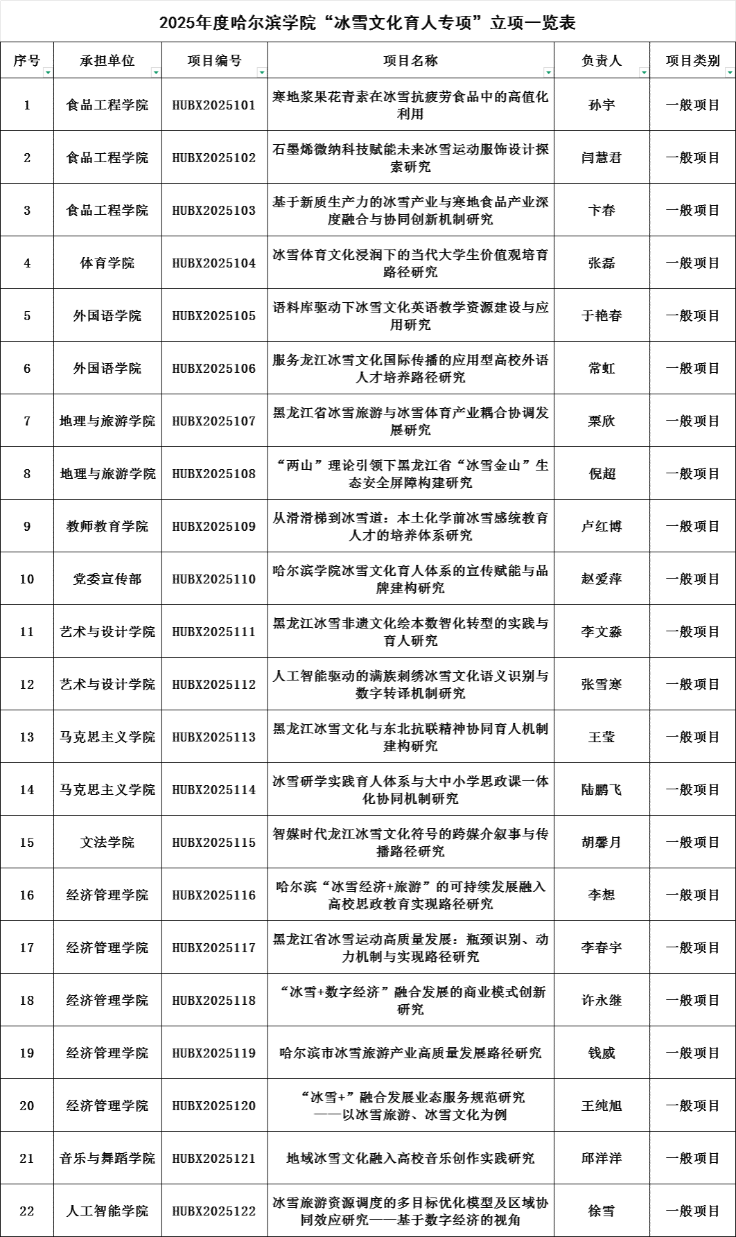 为深入贯彻落实习近平总书记关于“冰天雪地也是金山银山”的重要论述,充分发挥我校学科专业优势,推动冰雪文化、冰雪经济、冰雪科技等领域的创新研究,我校启动冰雪专项科研项目申报工作。经个人申报、资格审核、专家评审等程序,共有22个项目脱颖而出,获得立项资助。这些课题涵盖了冰雪经济、冰雪艺术设计、冰雪文化、冰雪旅游、冰雪体育、冰雪文化国际传播、寒地食品产业等多个领域,紧密结合地方冰雪产业发展需求,具有较高的学术价值和应用前景。