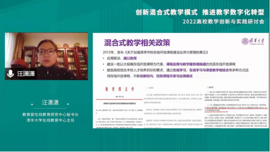 研讨会主题为“创新混合式教学模式 推进教学数字化转型”,旨在落实高等教育数字化战略,创新应用数字化课程资源,探索混合式教学新模式,推进高等教育教学数字化转型。教育部在线教育研究中心秘书长、清华大学在线教育中心主任汪潇潇出席会议并对自2015年以来教育部发布的混合式教学相关政策作出解读。她以《政策解读及清华大学混合式教学实践及探索》为题,结合丰富具体且生动的案例,从数字教学资源、智慧教学工具和学校政策支持等方面,介绍了清华大学开展混合式教学、融合式教学实践的相关经验,号召更多的高校在课程建设中“建以致用”,真正实现以学生为中心的教学。