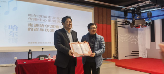 活动最后,龚宏院长向苗笛老师颁发哈尔滨城市文化研究与传播中心客座教授聘书,苗笛老师也将自己的代表著作《百年故乡音乐家》赠予中心作为留念。文法学院与哈尔滨音乐博物馆在教学和科研领域的合作也全面启动。今后,双方将在哈尔滨城市文化研究与传播领域开展进一步的学术交流与实践探索,将全省政治、经济、文化中心的特色资源优势转化为学科优势与办学优势。本次活动是文法学院新学期全面推进教育教学工作、加强学科建设的缩影,是全面落实学校2023工作要点的良好开端,是充分利用现有办学条件与教学科研资源,联合校外学术力量,服务于人才培养与学科建设进行谋篇布局的有益尝试。