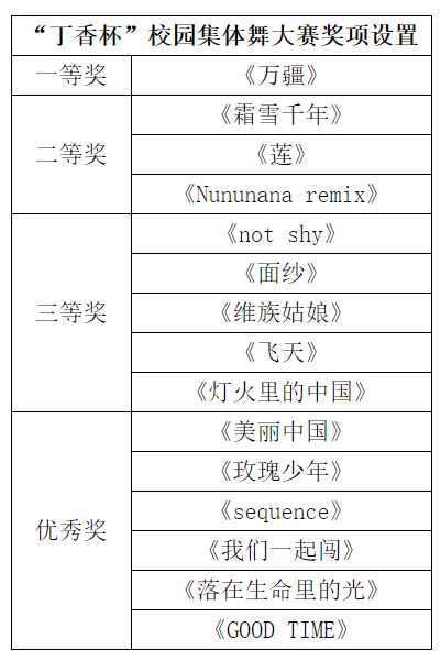 本届“丁香杯”校园集体舞大赛,各学院积极参与、认真编排,参赛选手服装整齐,青春靓丽,以“舞”会友,充分展现了当代大学生健康向上、奋发有为的精神面貌,为丰富我校学生课余文化生活、建设和谐校园做出了积极的贡献。