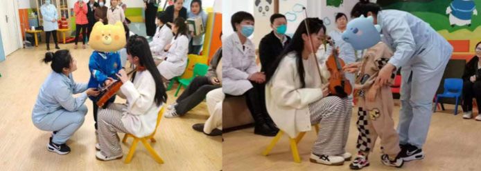 来自音乐与舞蹈学院的两位学生为大家演奏了小提琴和琵琶,让孩子们在欢快的氛围中感受到大家对他们的爱,孩子们对乐器产生极大兴趣,一个接一个地上前摸摸弹弹,产生了良好的互动效果。训练课后,双方进行了较为深入的交流,双方表示,将以此次爱心活动为起点,加强合作共建,实现双向奔赴,一起关爱儿童,给孩子一个美好的未来。