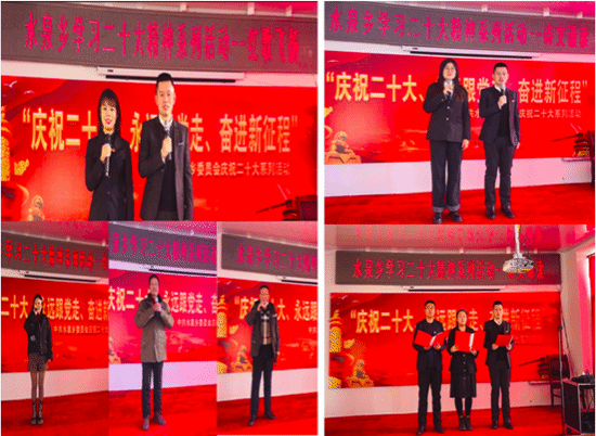 为学习宣传贯彻党的二十大精神,在乡党委的统一策划统筹下,谢添龙同志主持了“金秋十月,红歌飞扬”喜迎二十大革命红歌和励志歌曲比赛,参加了“忆百年征程,颂盛世华章”喜迎二十大诗文朗诵比赛,策划了“青春快闪送祝福,喜迎党的二十大”等活动。通过创新开展形式多样的党建活动,切实把干部群众的思想统一到党的二十大精神上来,弘扬“奋进新征程,建功新时代”主旋律。