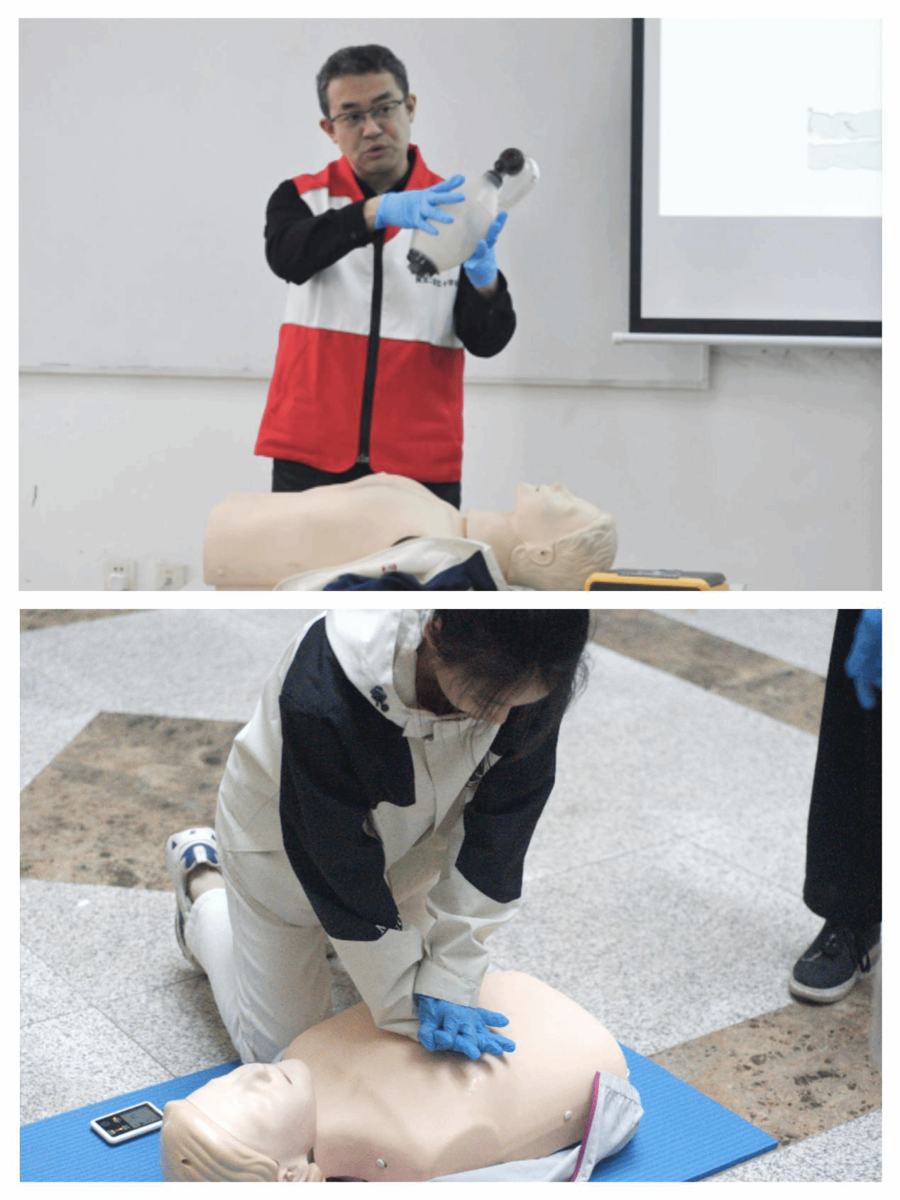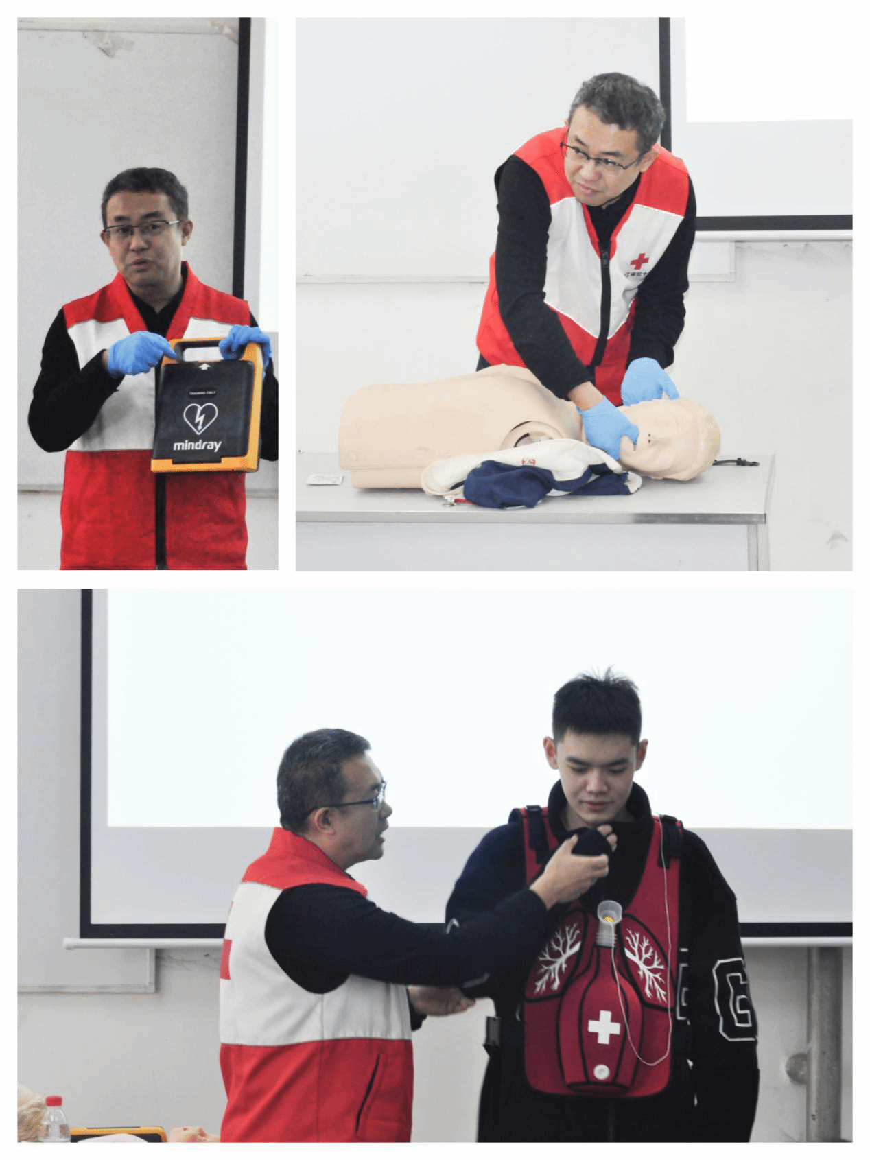 培训将理论学习考试和实操培训相结合,分为理论讲授引入、现场演示教学、实践操作辅导三个部分。培训教师利用模拟教具,从心肺复苏、气道异物梗阻、创伤救护等方面作了精彩的理论知识讲解和现场模拟演示。在演练阶段,培训师们通过手把手指导、零距离互动教学,让学员们更直观的了解和学习,加深了大家对于应急救护知识的理解,巩固了应急操作方法。学员们进行了分组练习,教学现场气氛热烈,互动积极,收效明显,大家基本掌握了心肺复苏等急救技能和AED的正确使用方法,提高了高校师生应对突发事件和意外伤害的应对处置能力,也对平安校园建设起到积极促进作用。