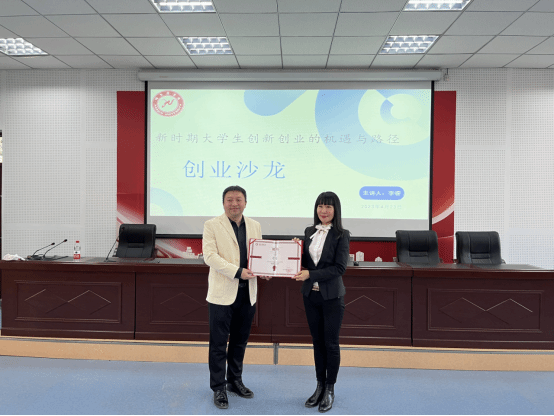 创业沙龙讲座开始前,创新创业学院举行创业导师聘任仪式,创新创业学院院长黄丽丽为李睿老师颁发哈尔滨学院创业导师聘书。