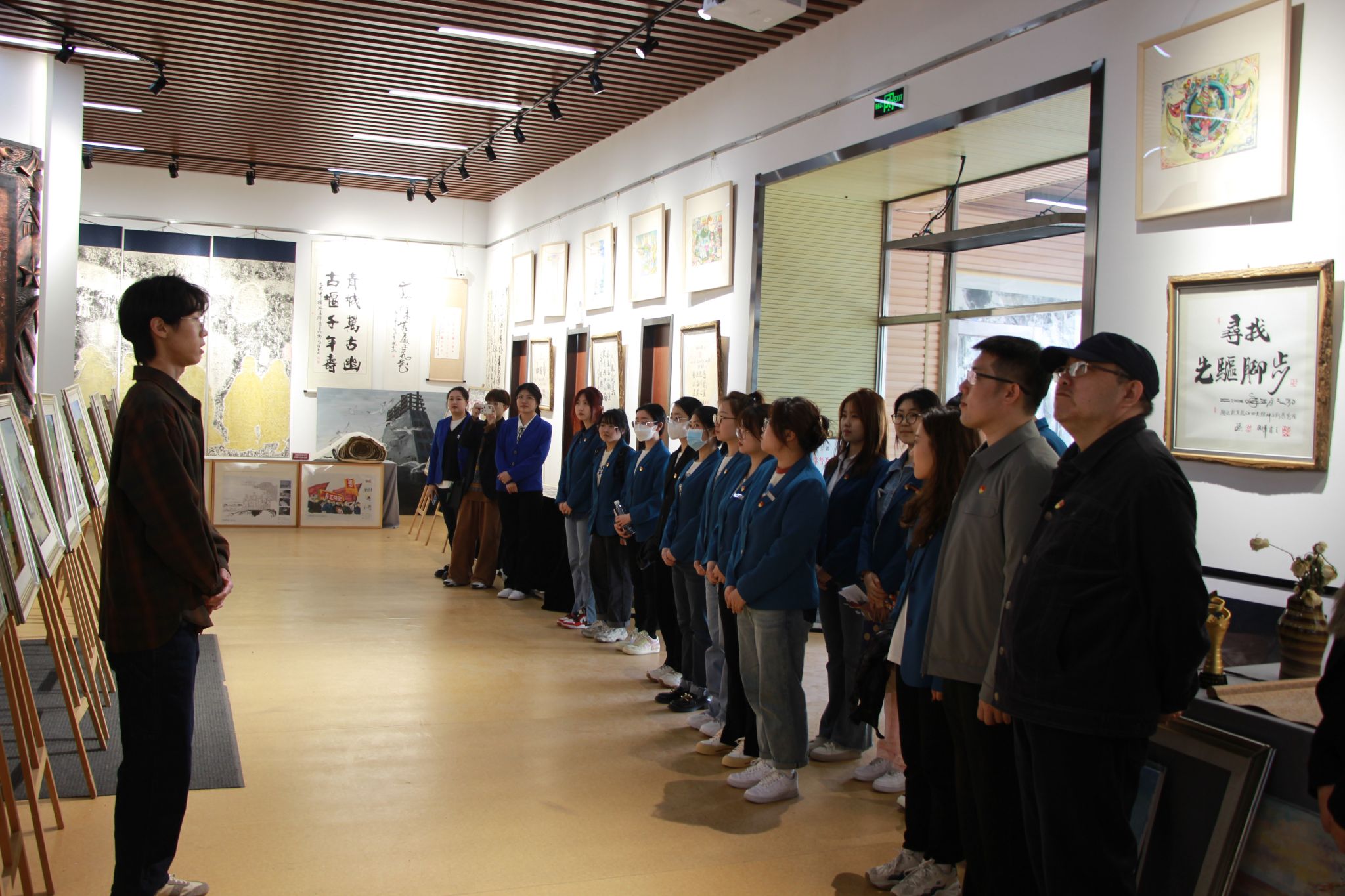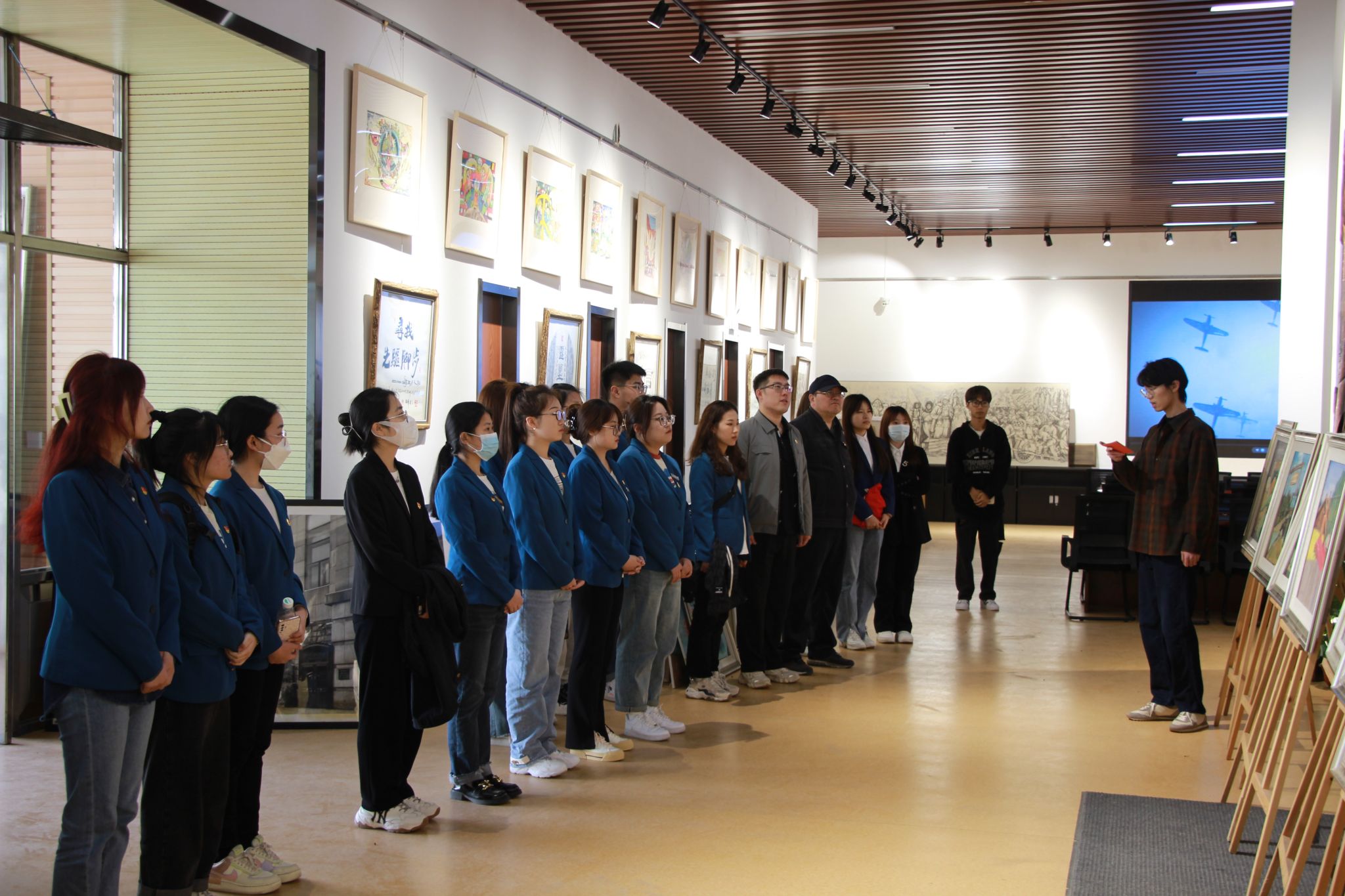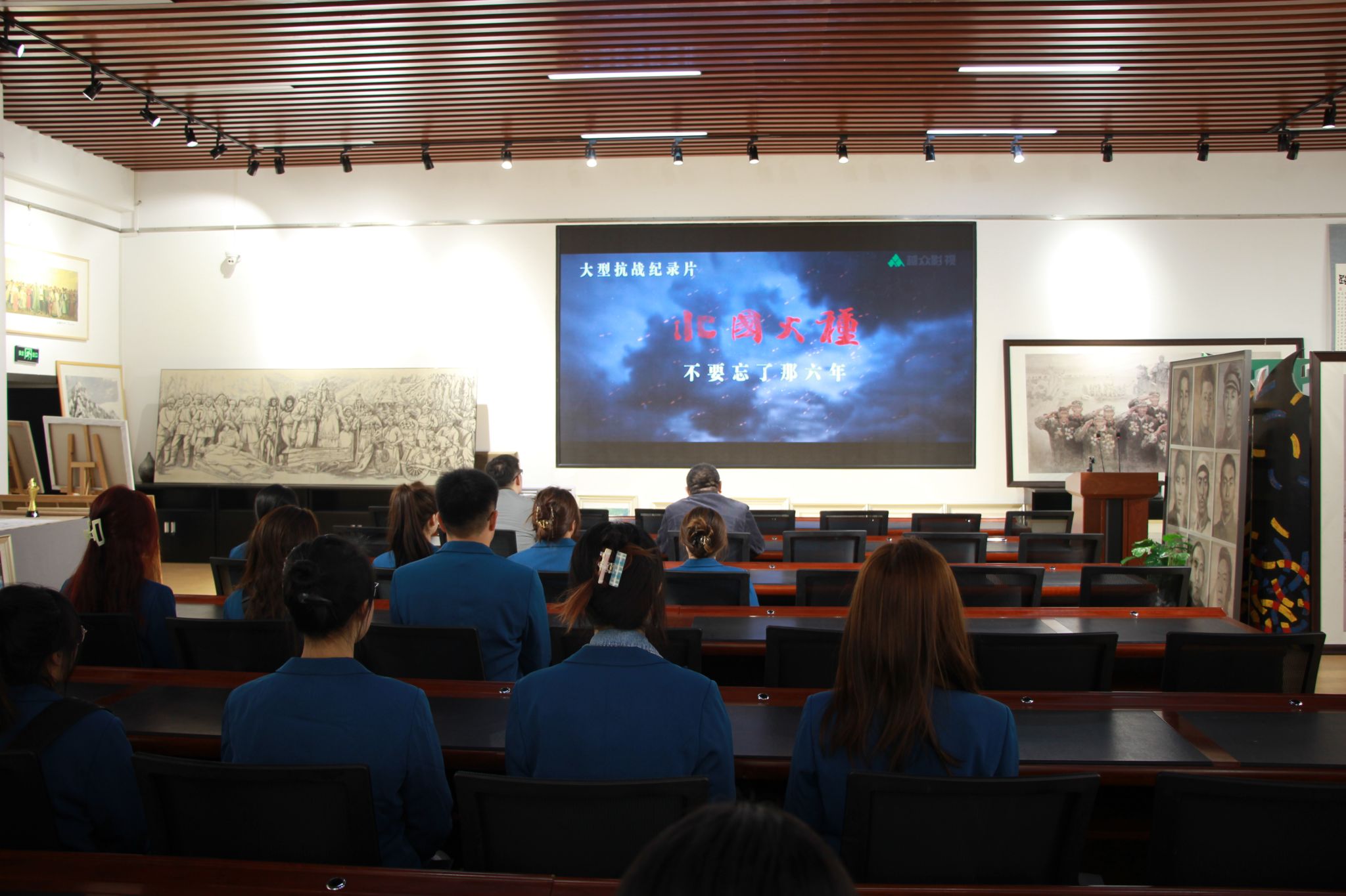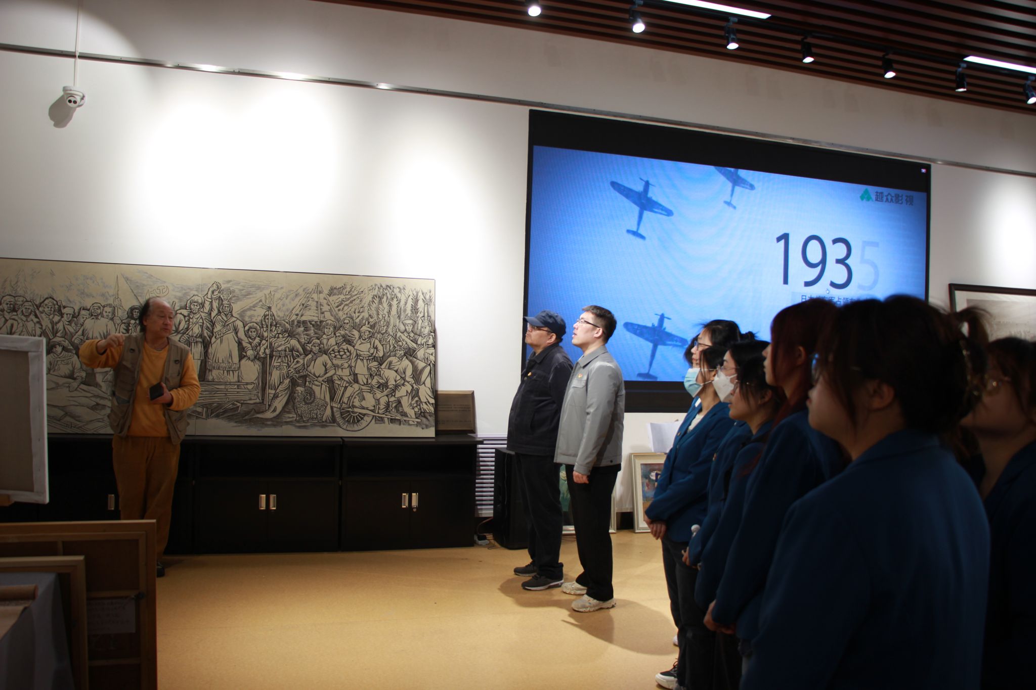 随着参观的不断深入,一副巨大的壁画立在角落,画作中讲述了抗联战士与少数民族的团结友谊,本幅壁画的作者艺术与设计学院宋荣丹老师循序渐进的讲述了这幅壁画的创作思路和创作过程,期间融入了东北解放的历史故事,流露出的情感打动了在场的所有人,将本次观展的气氛推向高潮。最后,大家共同观赏抗战英雄主题纪录片,为本次观展画上圆满句号。