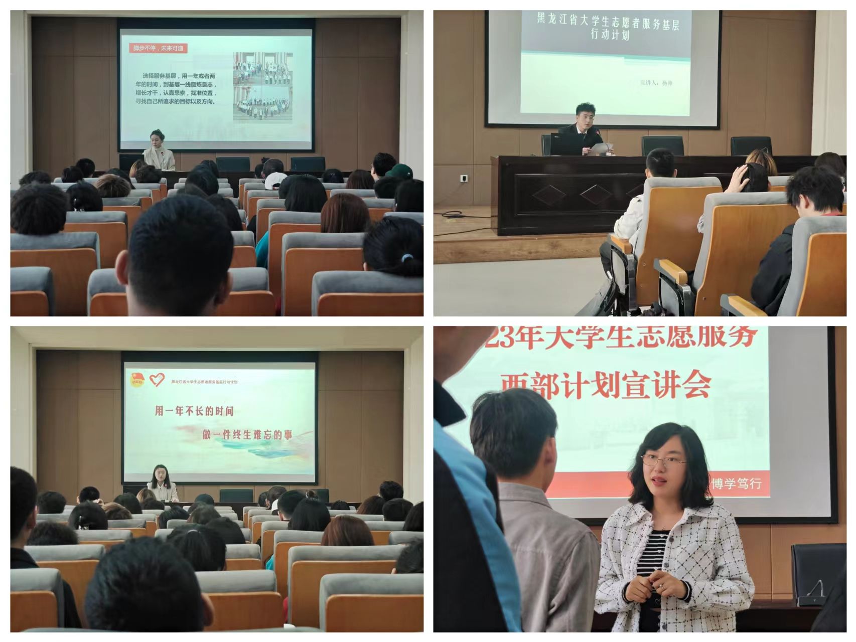 会上,道里区项目办宣讲人赵琪详细介绍了西部计划项目定位、服务内容、政策待遇、保障机制等;道里区群力街道办事处宣讲人杨帅围绕基层工作内容,讲述服务单位工作、生活的经历,畅谈了自己在基层的成长和感受,勉励更多的毕业大学生来到基层追梦、寻梦;我校2021年西部计划志愿者代表赫英钰以自身所在单位为例,讲述工作内容和优惠政策,让现场同学全面了解到“西部计划”的情况,同时,给应届毕业生提出了许多宝贵的建议,鼓励大家积极投身基层,丰富阅历,提升自我,到基层建功立业;最后,校团委黄婷婷老师对今年我校西部计划的工作要求、招募选拔、服务岗位、培训派遣等展开了详细讲解,结合我校往年工作开展情况,为有意愿参加西部计划的青年答疑解惑,对大家集中关注问题进行了全方面解读。