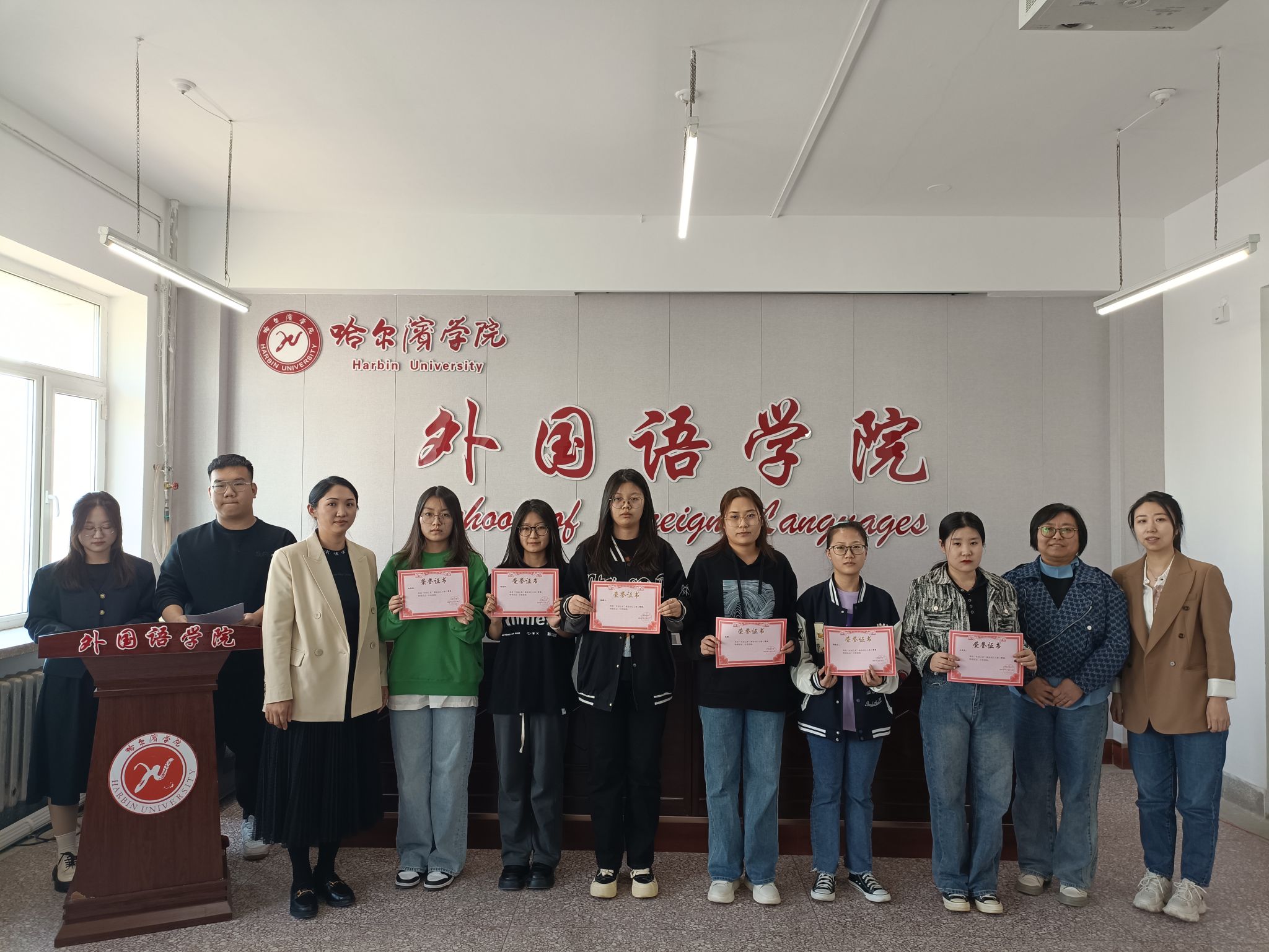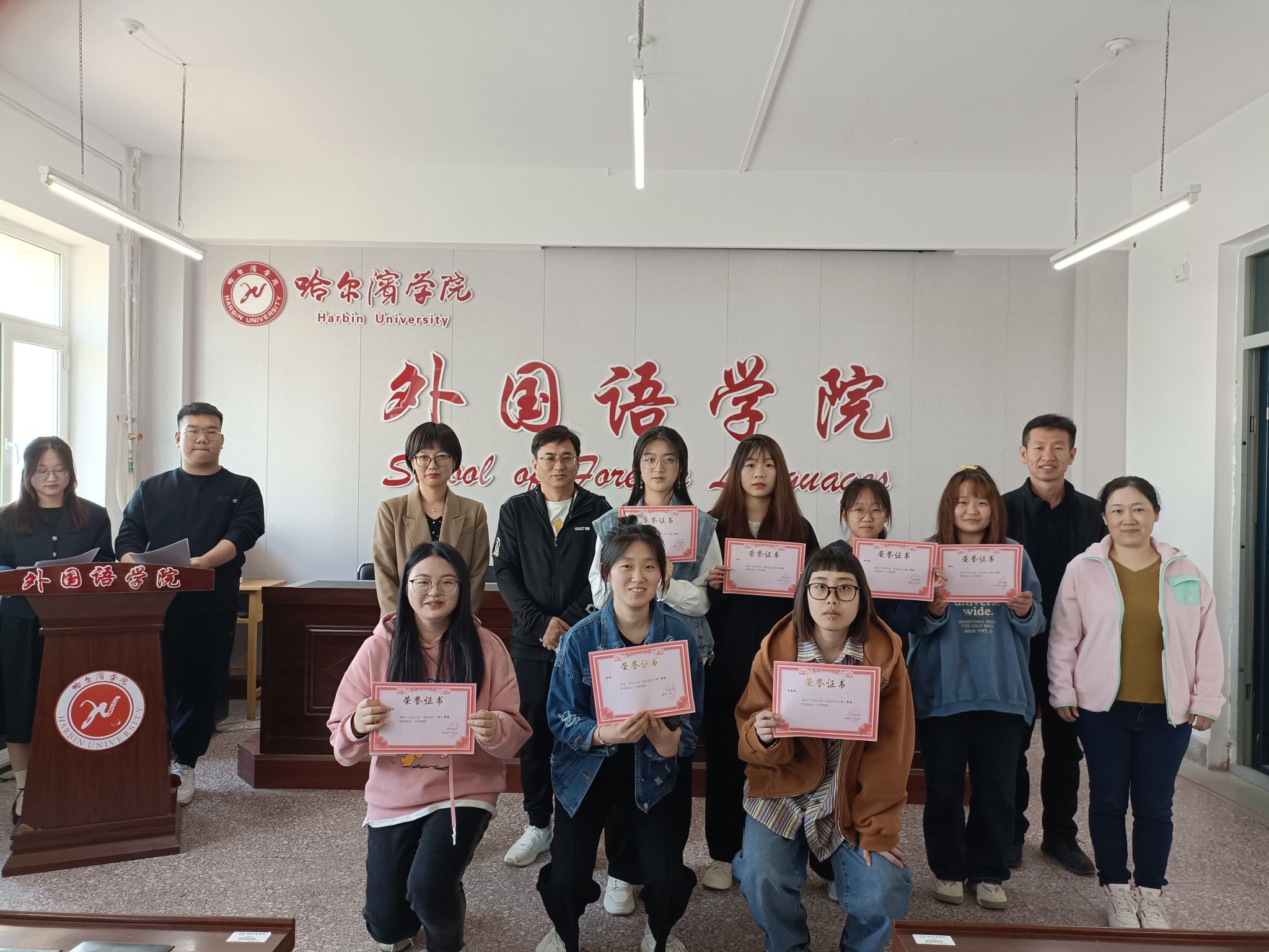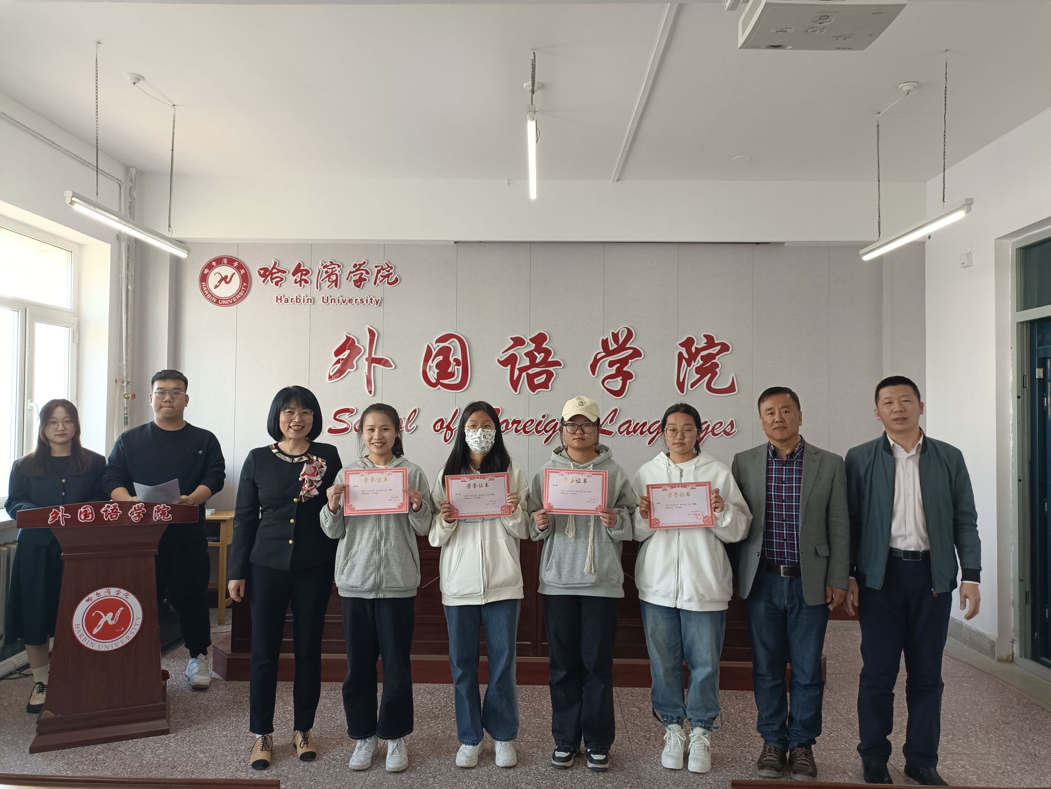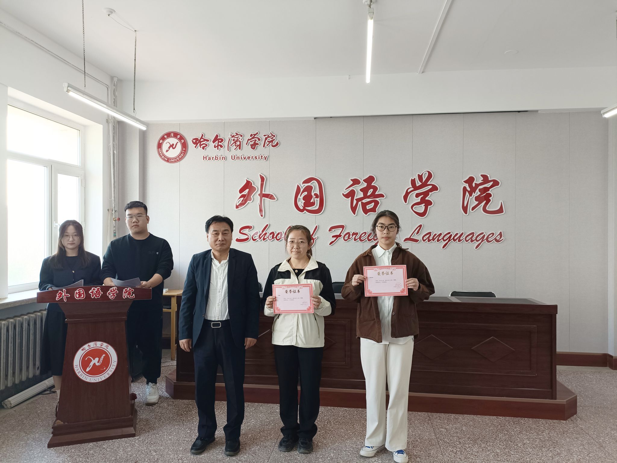 院长孙延弢向获奖学生表示热烈的祝贺,并鼓励学生积极参加各级各类学科竞赛,以赛促学,提升能力,早日成为“一高二有三强”式优秀外语人才,早日成为合格的社会主义事业建设者和接班人。