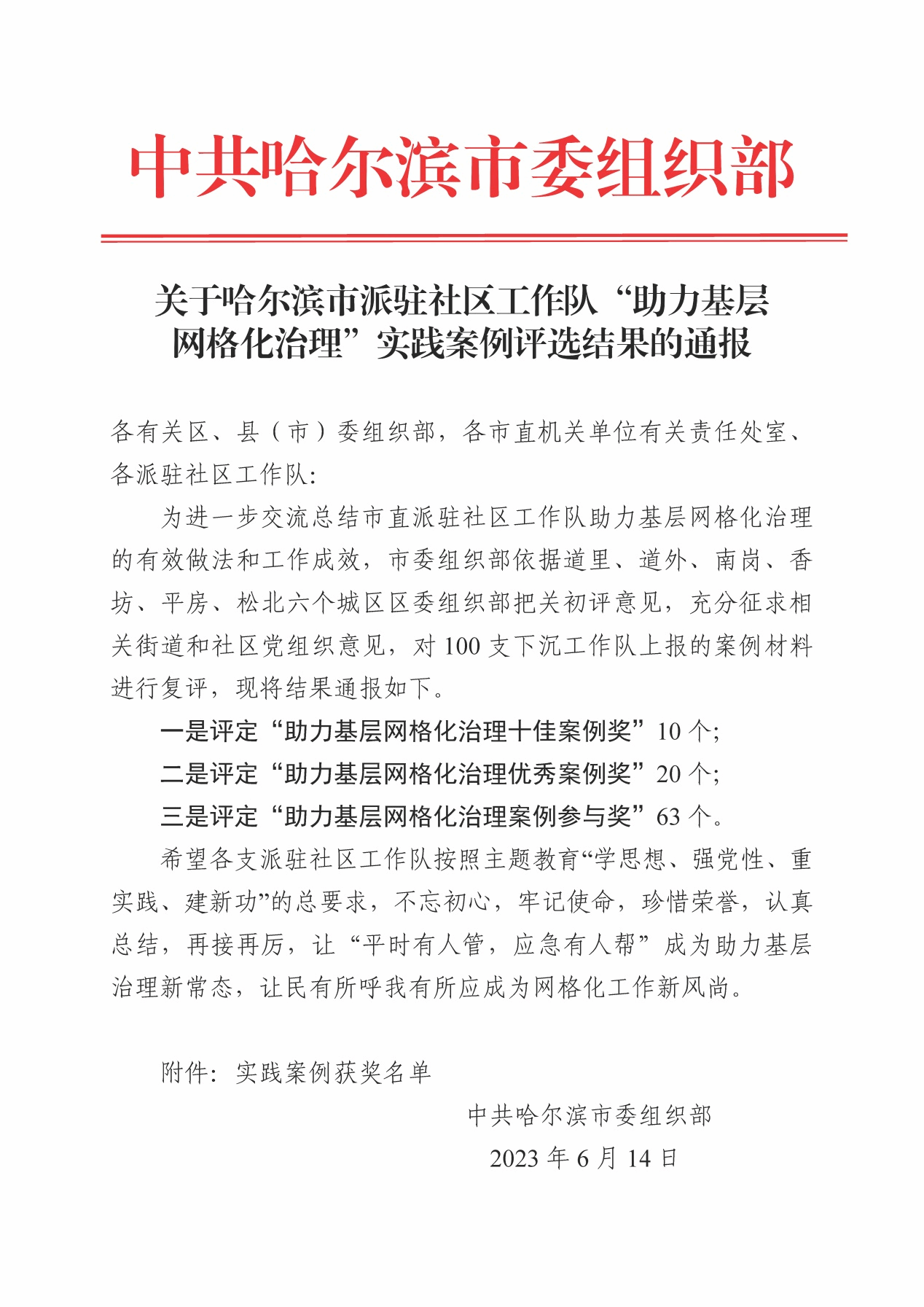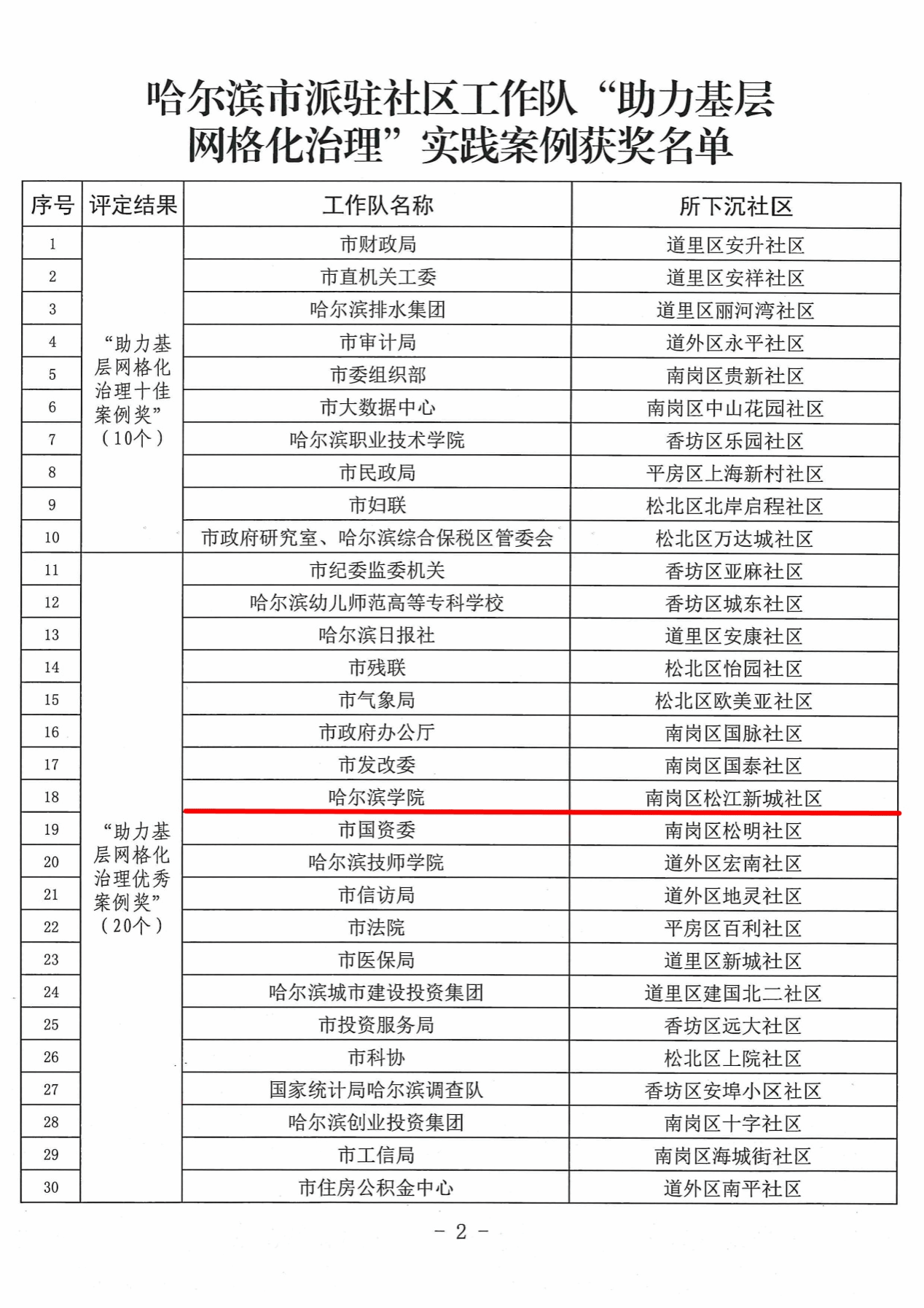(文/朱东鹤)为进一步交流总结市直派驻社区工作队助力基层网格化治理的有效做法和工作成效,市委组织部组织开展以助力基层网格化治理为主题的优秀案例评选活动,对100支下沉工作队选送的工作案例进行初评、复评,最终发布《关于哈尔滨市派驻社区工作队“助力基层网格化治理”实践案例评选结果的通报》。我校下沉包保松江新城社区工作队报送的《哈尔滨学院为松江新城社区量身打造网格化管理平台》案例,在100家包保社区的市直单位选送的案例中脱颖而出,荣获“助力基层网格化治理优秀案例奖”。