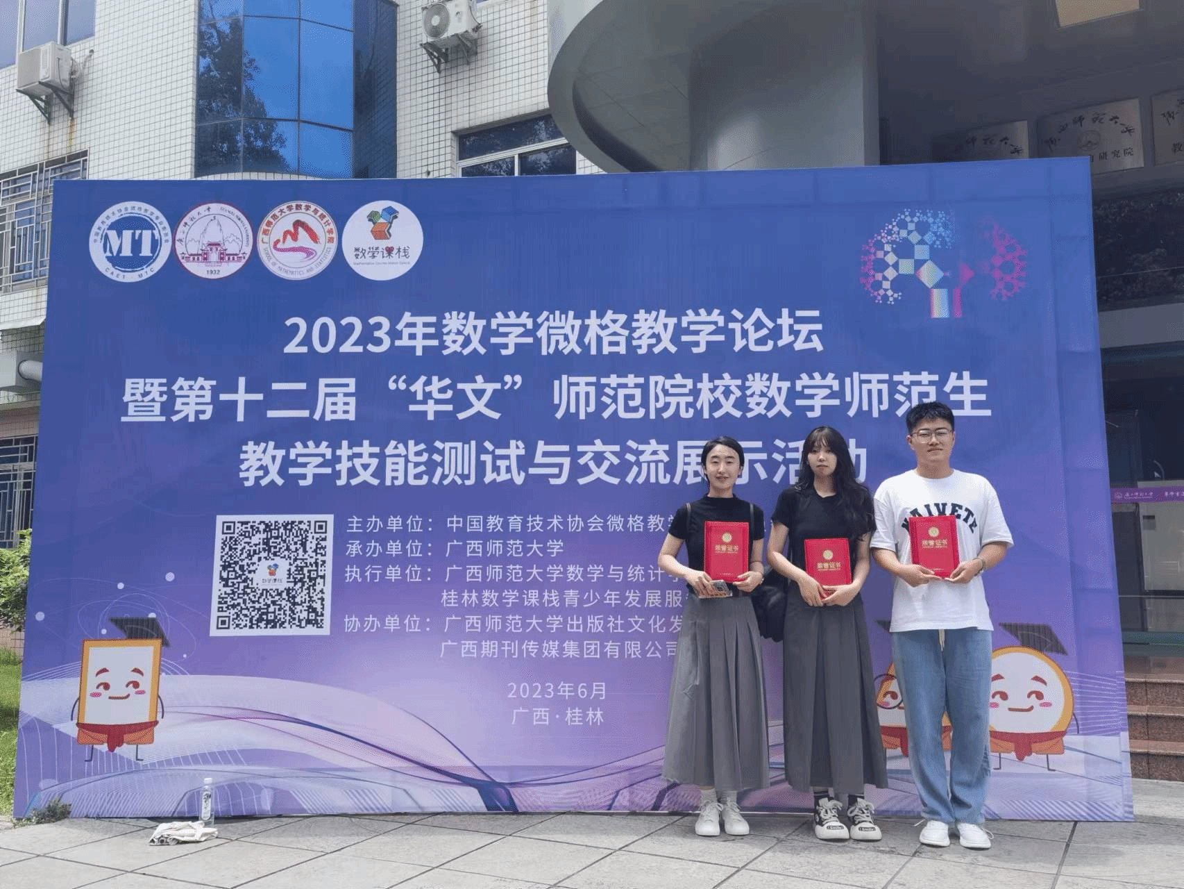 (文/林晓颖)6月23日至26日,由中国教育技术协会微格教学专业委员会主办,广西师范大学承办的2023年数学微格教学论坛暨第十二届“华文”师范院校数学师范生教学技能测试与交流展示活动在广西桂林成功举办。本届活动以“核心素养导向的数学微课设计和数学微格教学”为主题,吸引了来自华中师范大学、南京师范大学、湖南师范大学等全国96个院系单位2286名师生线上线下参与,其中参与线上微课测试活动的师生1830人,参与线下教学技能测试活动的师生456人,规模创历届新高。我校教师教育学院学生参赛并获佳绩。