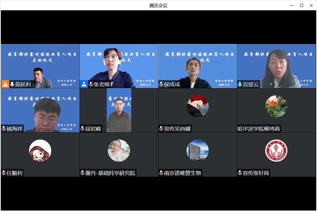 5月16日,项目组全体成员通过线上会议形式与合作企业举行了教育部供需对接就业育人项目启动仪式。会议由食品工程学院副院长莫延利主持,参加会议的有:就业工作处柳鸿莉、食品工程学院副处级辅导员张玉娟、化学系主任宫显云、食品系主任屈岩峰、19级辅导员侯成成。南京诺唯赞生物科技股份有限公司人力资源部校企合作负责人褚海洋、谭龙雨,基础研究综合部部门经理谢丹、生命科学部质检部经理任顺利。双方就项目实施预期目标、项目实施方案和项目实施计划进行了交流。
