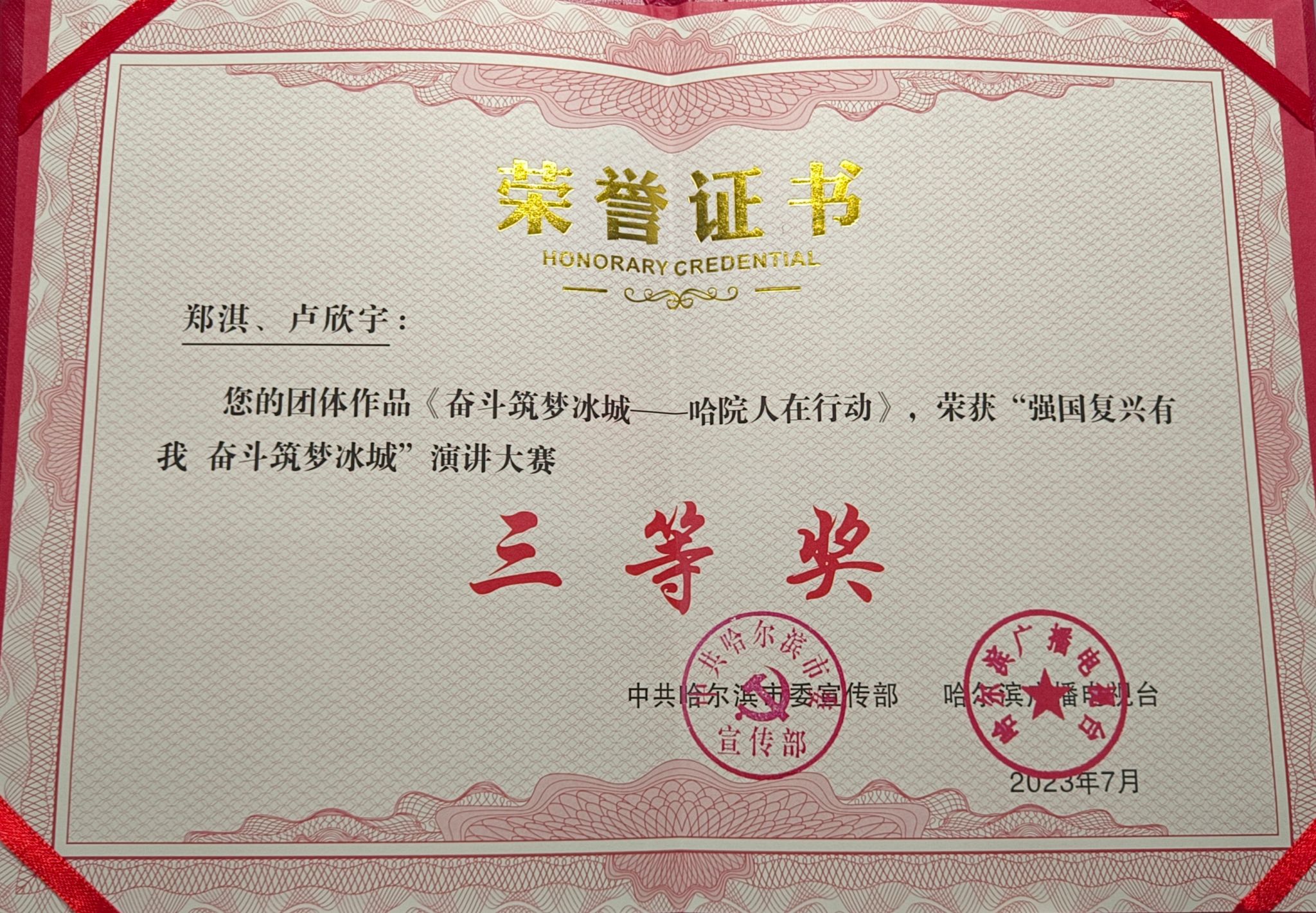 本次比赛从4月中旬推荐阶段、5月中旬初赛及培训阶段、6月初决赛阶段到7月初的颁奖仪式共历时两个半月的时间。5月16日,初赛在哈尔滨广播电视台进行,来自我市各行业的70多位参赛选手带着66件作品展开激烈角逐。我校推荐的来自文法学院、教师教育学院、经济管理学院、马克思主义学院的郑淇(团队)、李力(团队)、李思雨、刘任、王婧琦、张潘家瑞、陈美乐等7组学生组成代表队参与初赛选拔。经专业评委认定,由文法学院宫鹤桐老师指导的郑淇、卢欣宇团队作品《奋斗筑梦冰城——哈院人在行动》进入决赛,并荣获三等奖。