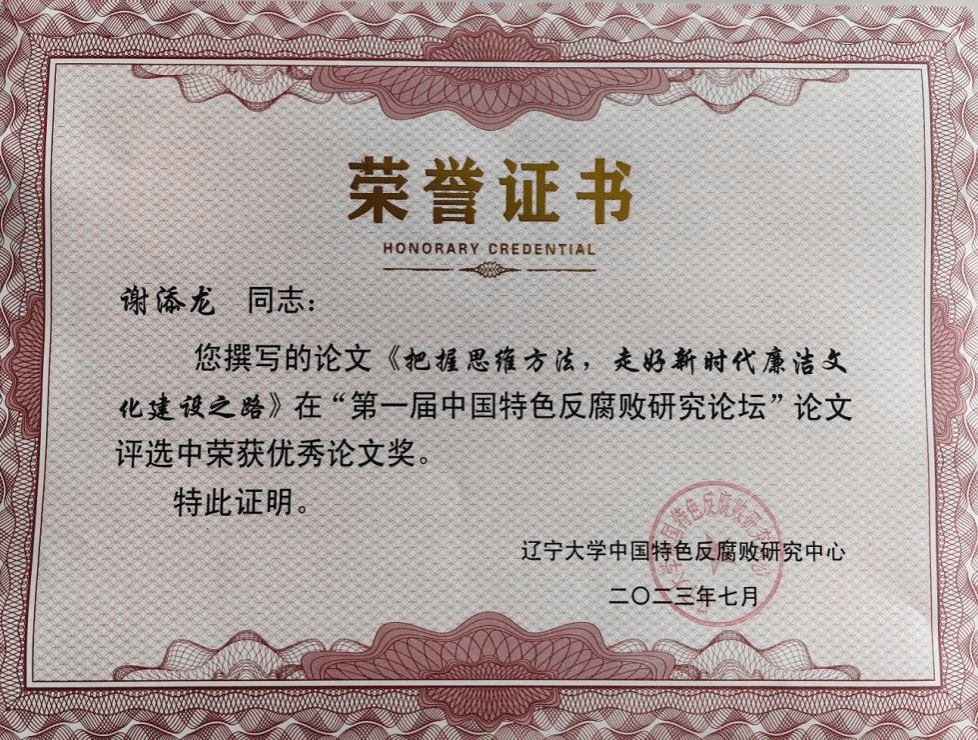 学校纪委办公室谢添龙同志撰写的论文《把握思维方法,走好新时代廉洁文化之路》被辽宁大学中国特色反腐败研究中心评选为优秀论文,并受邀参加“第一届中国特色反腐败研究论坛”并作主题发言。