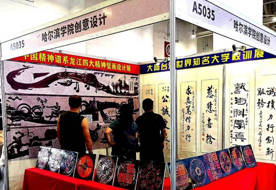 经哈尔滨市委宣传部推荐,哈尔滨学院艺术与设计学院(时尚创意设计产业学院)“大学校训〞、“龙江精神”两大类迭代文创产品应邀参展。共展出由台湾省书画教育协会原会长苏安德、黑龙江省高等院校书法协会常务副会长兼秘书长孙国辉不同时期创作的世界知名大学校训书法和陶板篆刻设计作品30余幅,由宋荣丹创作的“龙江精神”主题设计壁画一套。