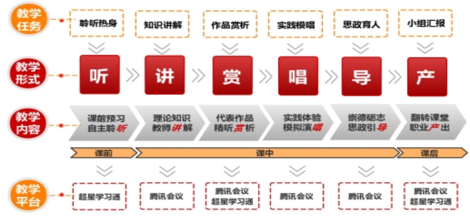 为了推进“培养具备师德修养,教育情怀,创新型教学能力的应用型中小学音乐教育人才”的目标,本课程在多年线下教学实践的总结与探究基础上,结合线上授课特点及平台特色,增设学生实践模唱学习环节和小组课程汇报环节,理念构建了“听-讲-赏-唱-导-产”六维教学模式。